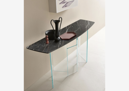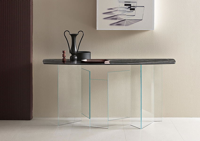 The console is part of a furniture collection characterised by a base in extra clear or smoked glass.