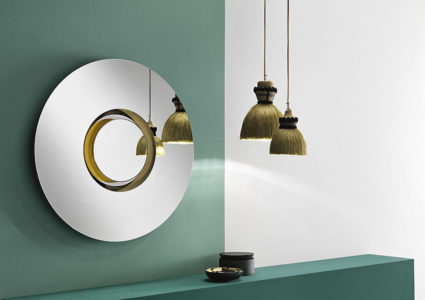 Ozma is a round and concentric wall mirror with central rim in gilded metal.