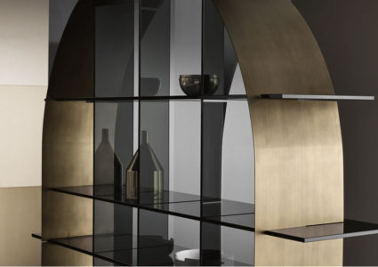 Interlocking geometric component made of thin metal sheet in the shape of an arch or circle in brushed bronze or brushed black finish.