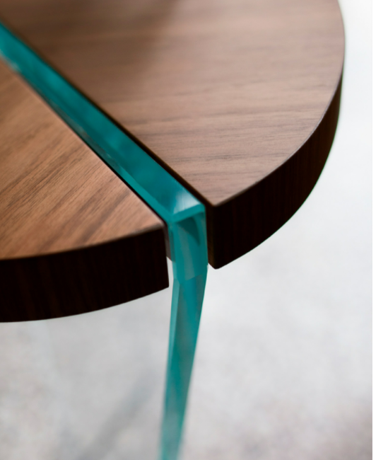 Come l’amore della principessa, anche Aida si fonda su due elementi estremamente diversi: una base in vetro trasparente, in tre linee rigide; un piano rivestito in legno noce canaletto, o rovere scuro termotrattato, tondeggiante. Una lavorazione complessa per armonizzare materie e disegni.