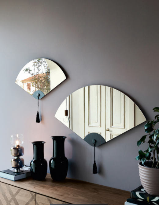 Sarà come avere un ventaglio, un magnifico oggetto dalla leggerezza ormai mitica, in cui rivedersi e dove osservare la luce che si riflette, che allarga ogni ambiente in cui si trova. Winderly è uno specchio che si poggia su di una struttura in legno, la cui semplicità viene arricchita da una splendida nappa nera