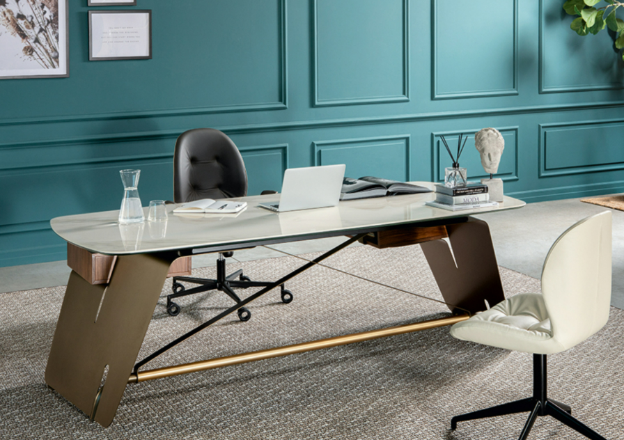 La scrivania direzionale Bridge dalle ampie dimensioni è impreziosita dal top in porcellanato e dalle eleganti finiture in bronzo e oro satinato. Il piano dal profilo morbido e dalla geometria sottile dai bordi smussati offre un appoggio confortevole a chi lavora. La base di Bridge richiama nel nome il suo design evocativo e comunica apertura e dialogo, invitando alla condivisione. Bridge è allestito con cassetto laterale e dotato sul lato esterno di un pratico vano portaoggetti.