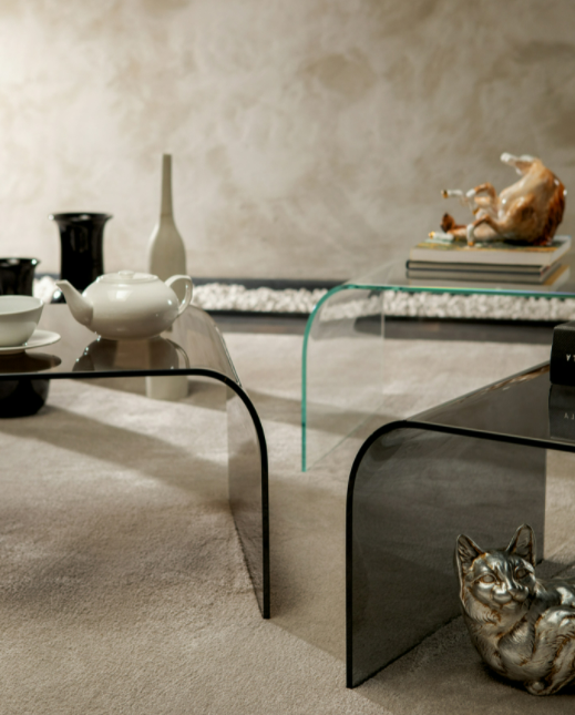 Tavolino dalla linea sinuosa e minimal, in finitura extrachiaro, bronzo o fumè. Disponibile in tre misure.