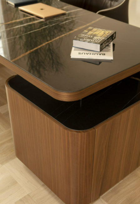 Estetica e funzionalità si fondono in Ermes, la nuova scrivania direzionale in legno termocurvato firmata dall’arch. Angelo Tomaiuolo, che con il suo design invita alla condivisione, offrendo un confortevole e ampio piano di appoggio, impreziosito dal top in porcellana.
