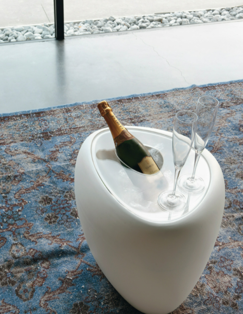 Innovativo tanto nel design che nell'uso del polietilene, Ios vive delle sue varianti di colore, nella struttura, nel piano in plexiglass o legno, e nella versione con vano porta-bottiglie.