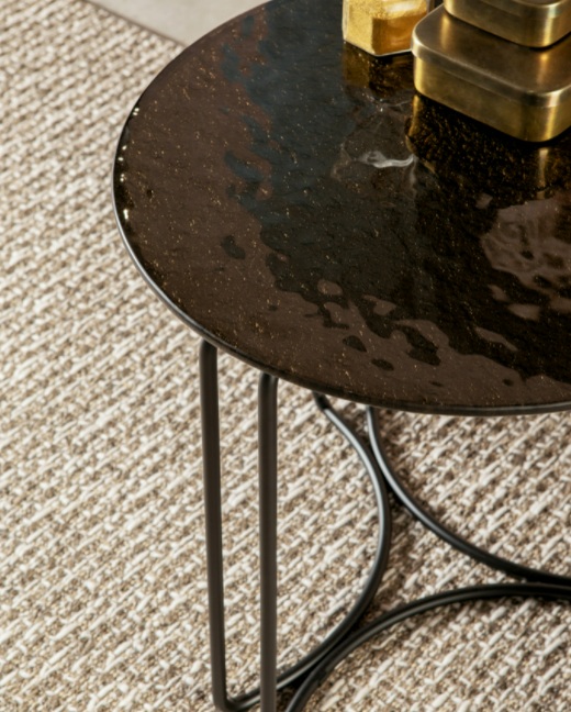 Da’ alla tua casa una nuova prospettiva glam con la serie di tavolini Jazz in due misure e varie finiture: servetto e tavolino con top in vetro o vetro martellato e base in metallo verniciato.