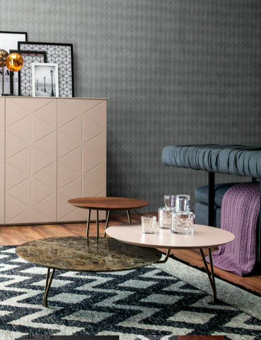 Le combinazioni di materiali e colori, offerte dai marmi e dai laccati, lo rende un punto focale perfetto della zona living.