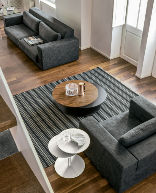Due piani che si muovono come anelli attorno ad un'orbita, ad altezze diverse e leggermente spaiati, per creare un effetto di movimento e leggerezza.
