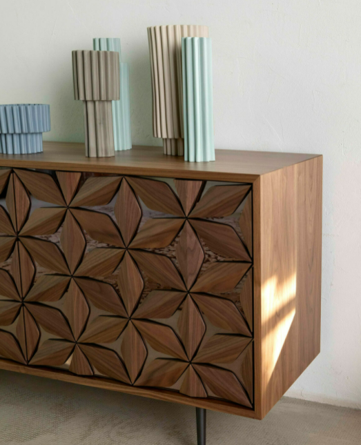 La madia All Star fonde la sua linea essenziale alla preziosa costellazione di petali in legno massello, applicati a mano, che ricoprono le ante dalle basi specchiate, per un elemento unico di design e alta artigianalità.