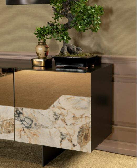 Un elemento iconico, con struttura portante in legno laccato nero e base in metallo verniciato, le ante in vetro tono bronzo o fumè sono impreziosite con inserto in gres porcellanato dalle venature calde che accarezzano la superficie della madia, sollecitano al tatto e sprigionano luce e energia. Disponibile in varie finiture.
