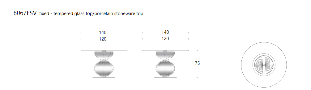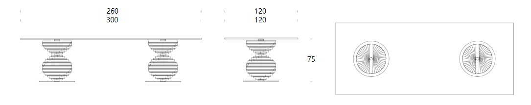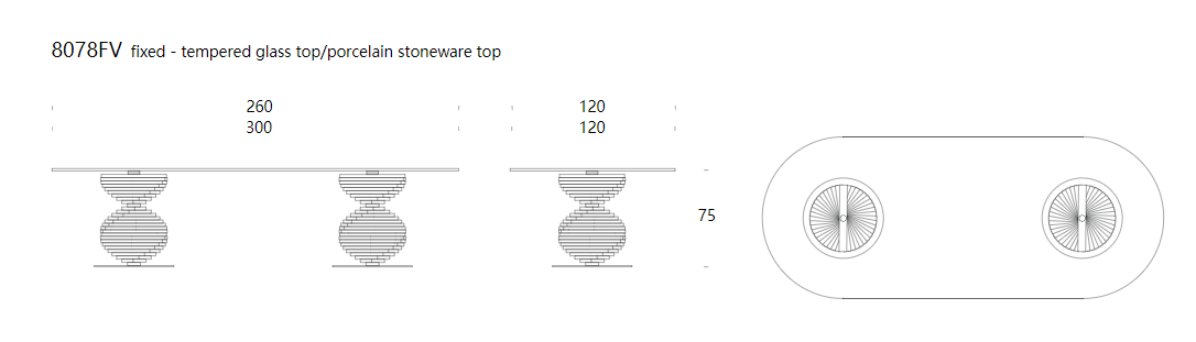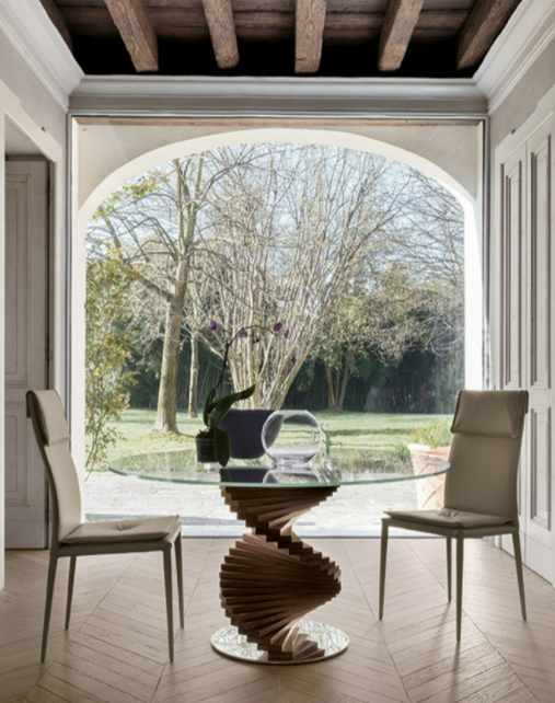 La caratteristica principale del tavolo Firenze è la base di listelli in legno massiccio noce canaletto, o rovere scuro. I listelli vengono accoppiati uno ad uno, per creare una scultura a spirale che crei un elegante effetto ottico. Un piano in vetro, o gres porcellanato, disponibile in più misure, chiude la struttura.