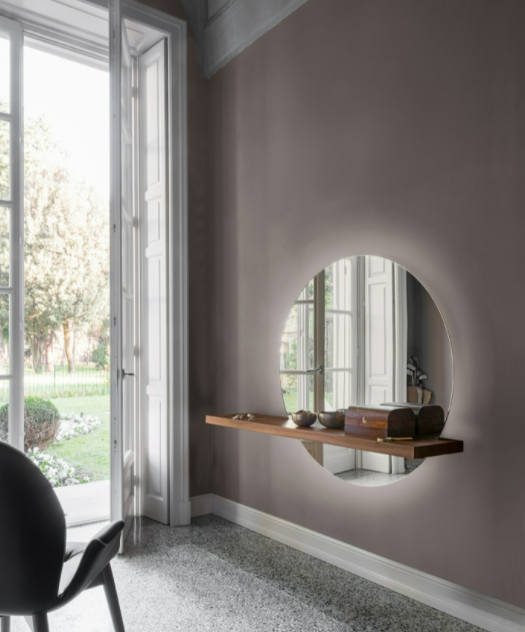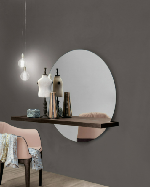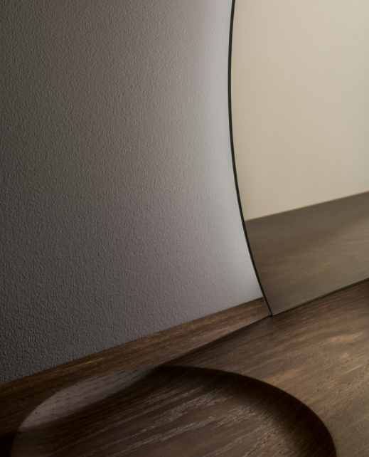 Proprio come il tramonto, il cerchio perfetto formato dalla specchiera Sunset si sposta verso destra, creando un pittoresco effetto di sbilanciamento. Lo specchio è disponibile nella versione argentata e in quella bronzata, in modo da adattarsi a diversi contesti luminosi. La mensola in legno noce canaletto, o rovere scuro termotrattato taglia il “sole” a tre quarti, proprio come farebbe la linea dell’orizzonte.