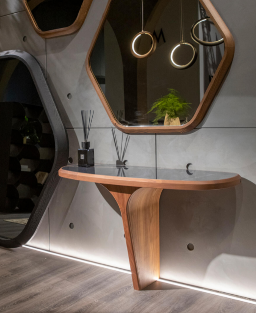 L’elegante top in porcellana è incorniciato dal prezioso bordo in legno massello, in una combinazione che cattura lo sguardo e si distingue per l’eleganza del design.
