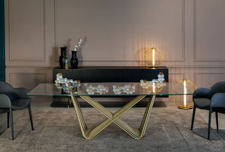 deciso, incontrando i vari top nelle diverse finiture della gamma Tonin Casa: vetro, porcellana, legno, marmo. Un tavolo dalla forte identità che si adatta perfettamente ad ogni stile di interni.