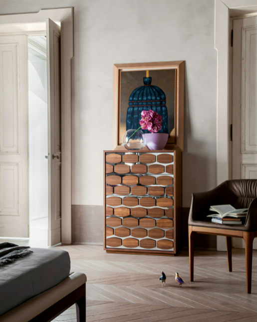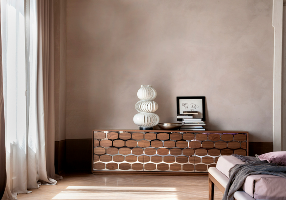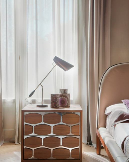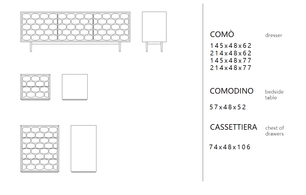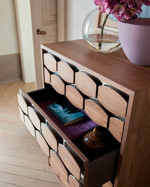 Un programma per un luogo di riposo, dove spazi e linee hanno un ruolo fondamentale. Comò, comodino e cassettiera Honey Night si distinguono per la difficile lavorazione di legni, in noce canaletto e rovere scuro termotrattato, e l’azzeccata scelta di specchi capaci di ampliare l’intera stanza.