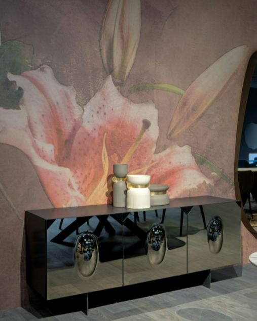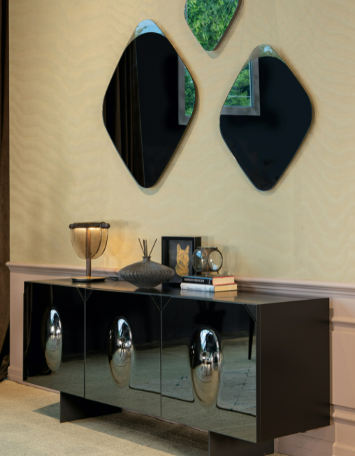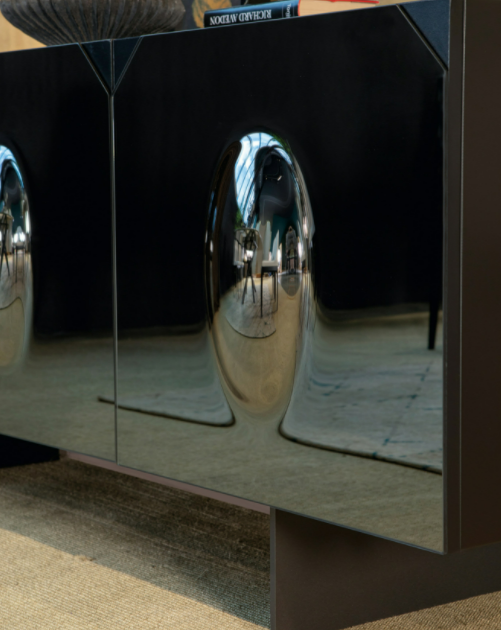 La dimensione onirica e sospesa di questa madia richiama le atmosfere del pittore statunitense Edward Hopper. Nelle ante in cristallo bombato, specchiato bronzo o fumè, spiccano volumi che richiamano un universo quasi metafisico ed esaltano l’estetica potente di questa madia in una combinazione preziosa di luci e ombre, che cattura lo sguardo.