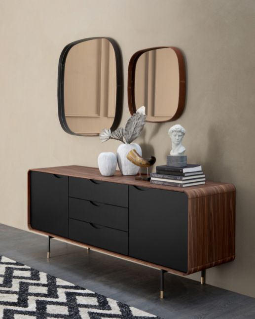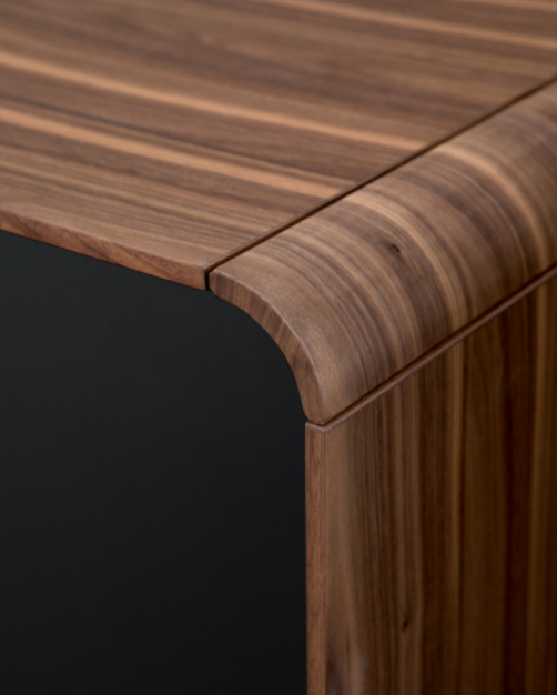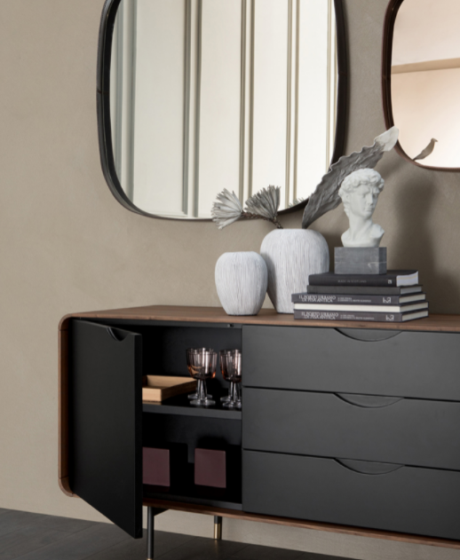 Un design a tutto tondo dove il legno curvo accoglie ante e cassetti laccati neri o bianchi. I dettagli fanno la differenza e la rendono unica e adatta al tuo living.