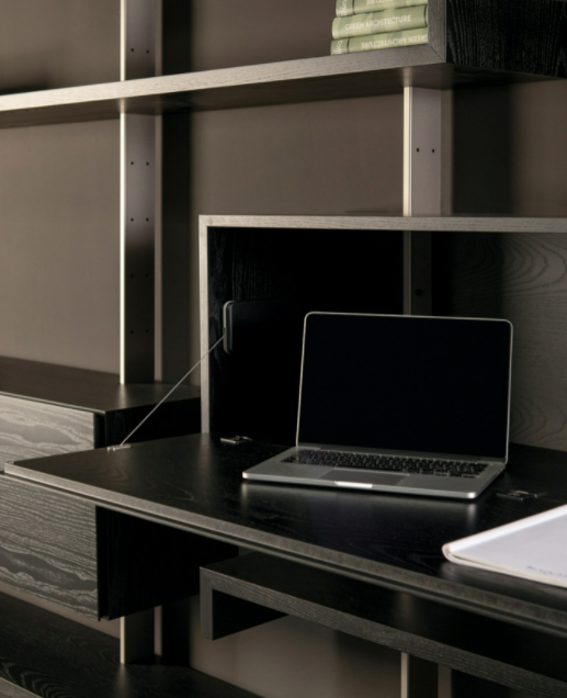Questa libreria è composta da una serie di mensole che creano movimento, interrompendo la continuità della parete. Oltre ai ripiani, si possono aggiungere anche dei cassettoni di varie dimensioni, così da avere più spazio contenitivo