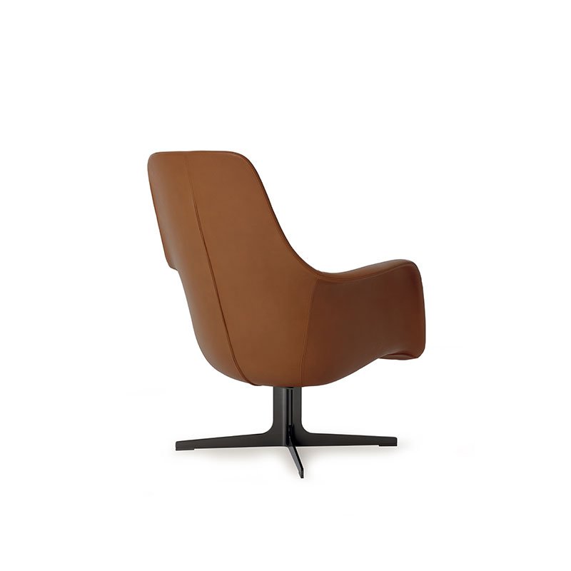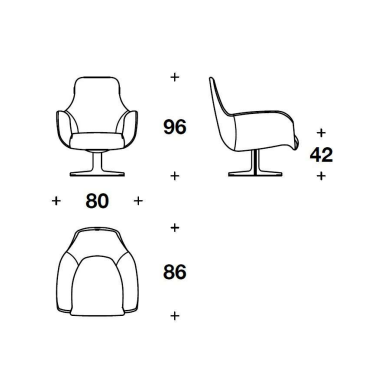 Eclectic and ironic, CipCip armchair proposes an iconic curved silhouette covered in fabric or leather with Oval Logo embroidery on the back. Steel base with gun-metal grey or Silk varnish bronze colour finishing.