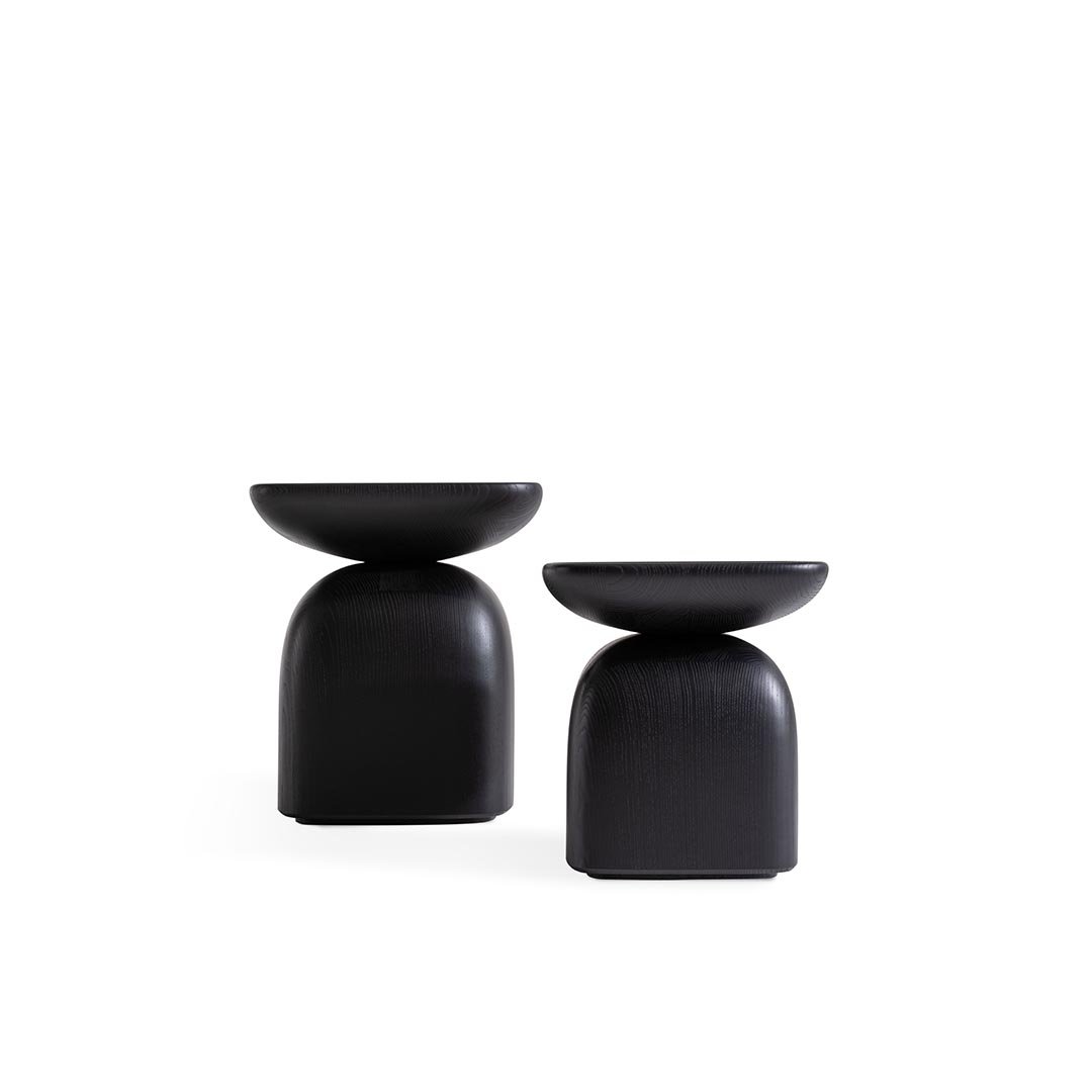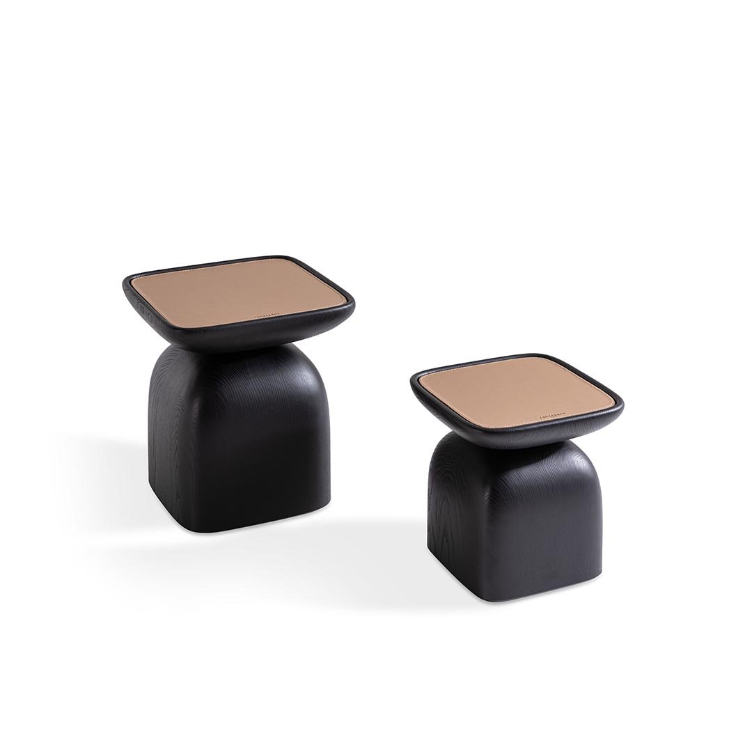 They are made from matt black ash and consist of two highly organic elements. Two large and solid bases support two wide leather tabletops, appearing as if they are suspended on the line between waking and sleeping.