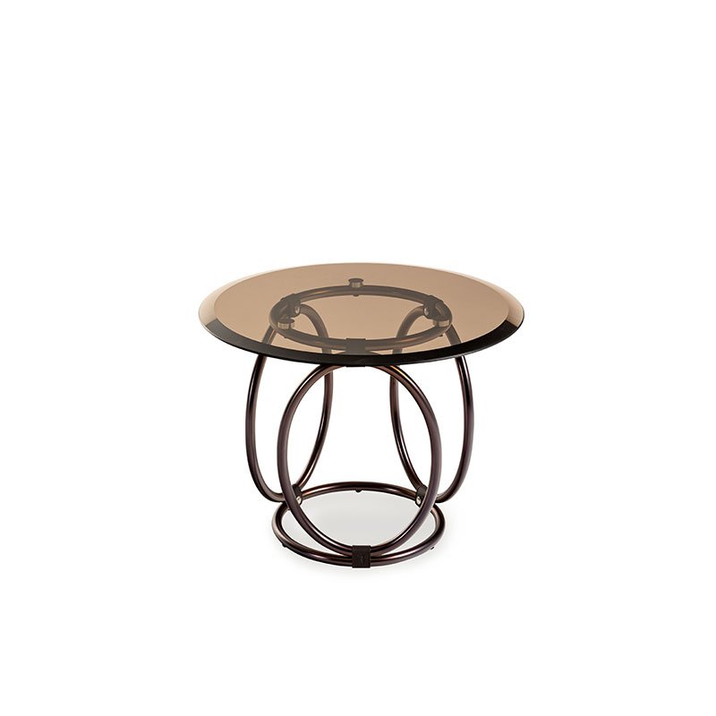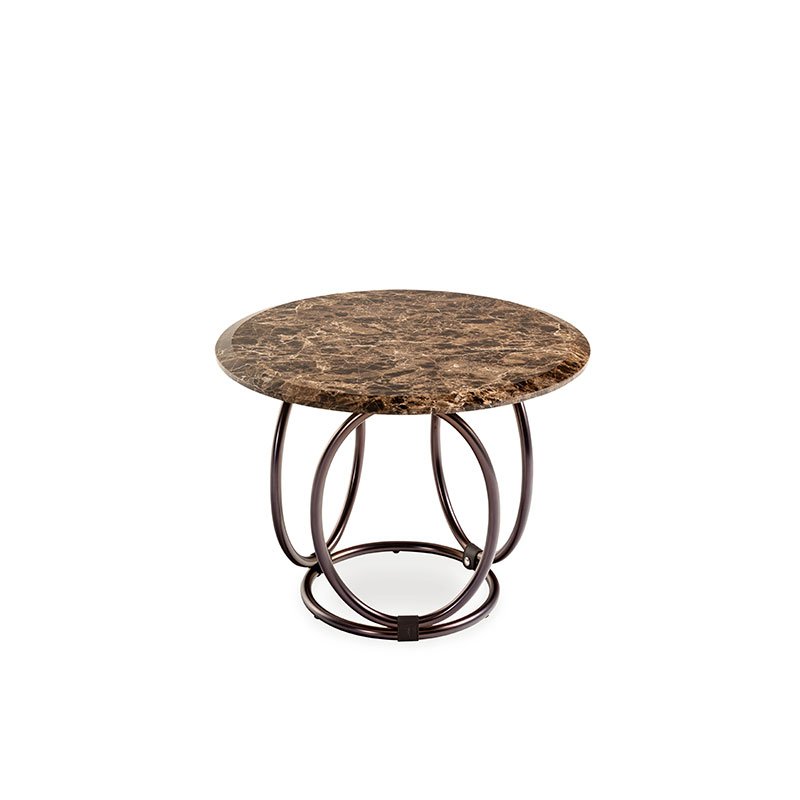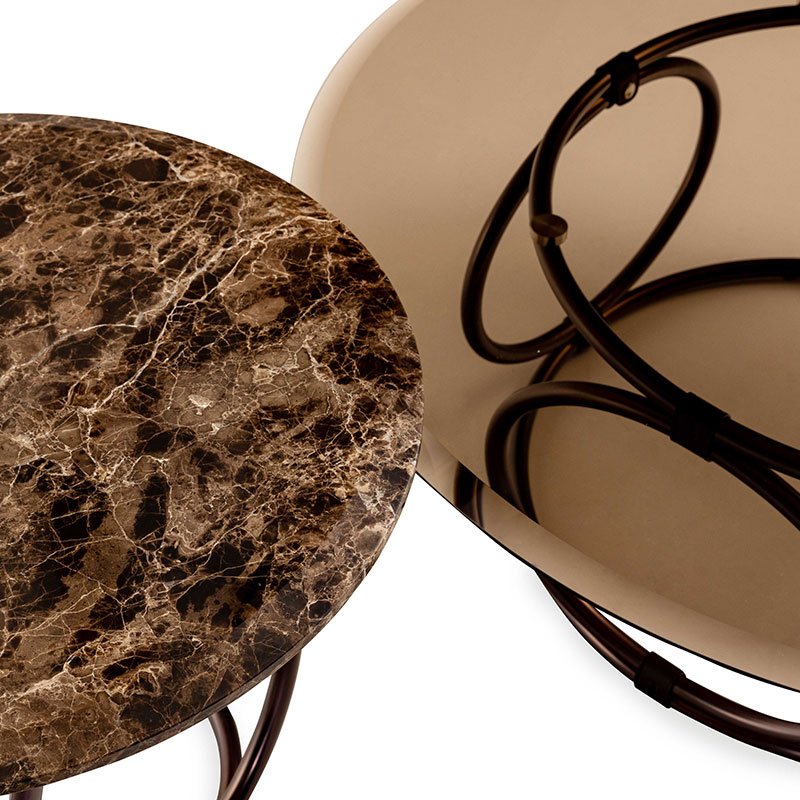 The coffee and side tables Oval present a steel frame with Dark Matt Bronze finishing and Greyhound logo on leather details in Dark Chocolate colour. Top in bronze tempered glass or Carrara White, Emperador Dark or Breccia Sarda marble.
