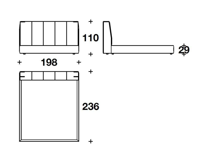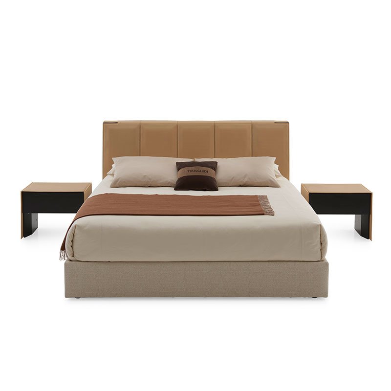 Elegant and rational in its geometry, it is defined by a leather element worked with maxi vertical lozenges which completely envelops the surface of the large headboard with squared contours.