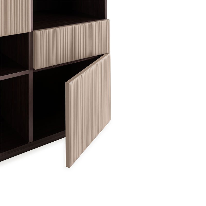 The leather doors sporting the Vertical quilting are combined with drawers and open shelving to create ideal volumes that meet all functional requirements.