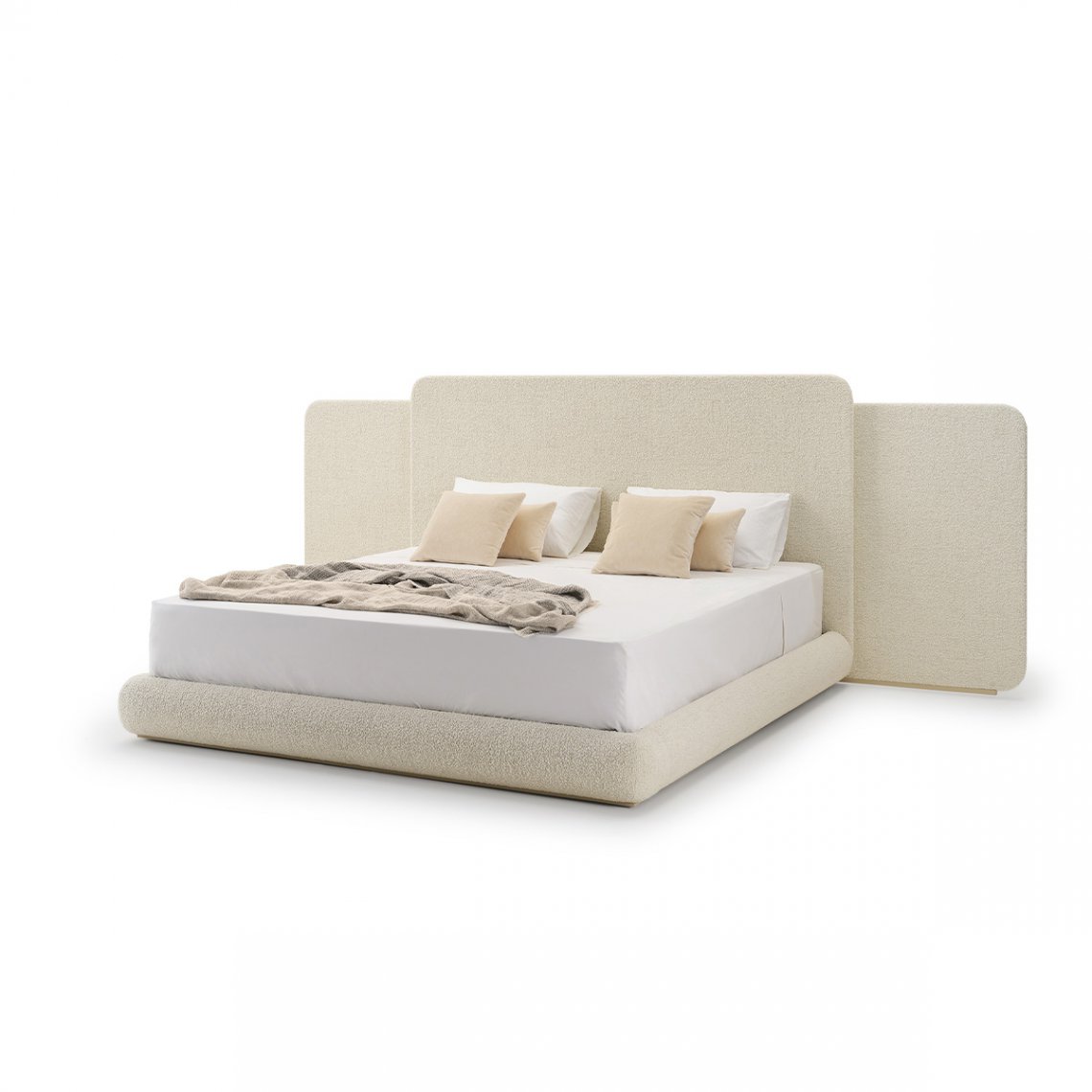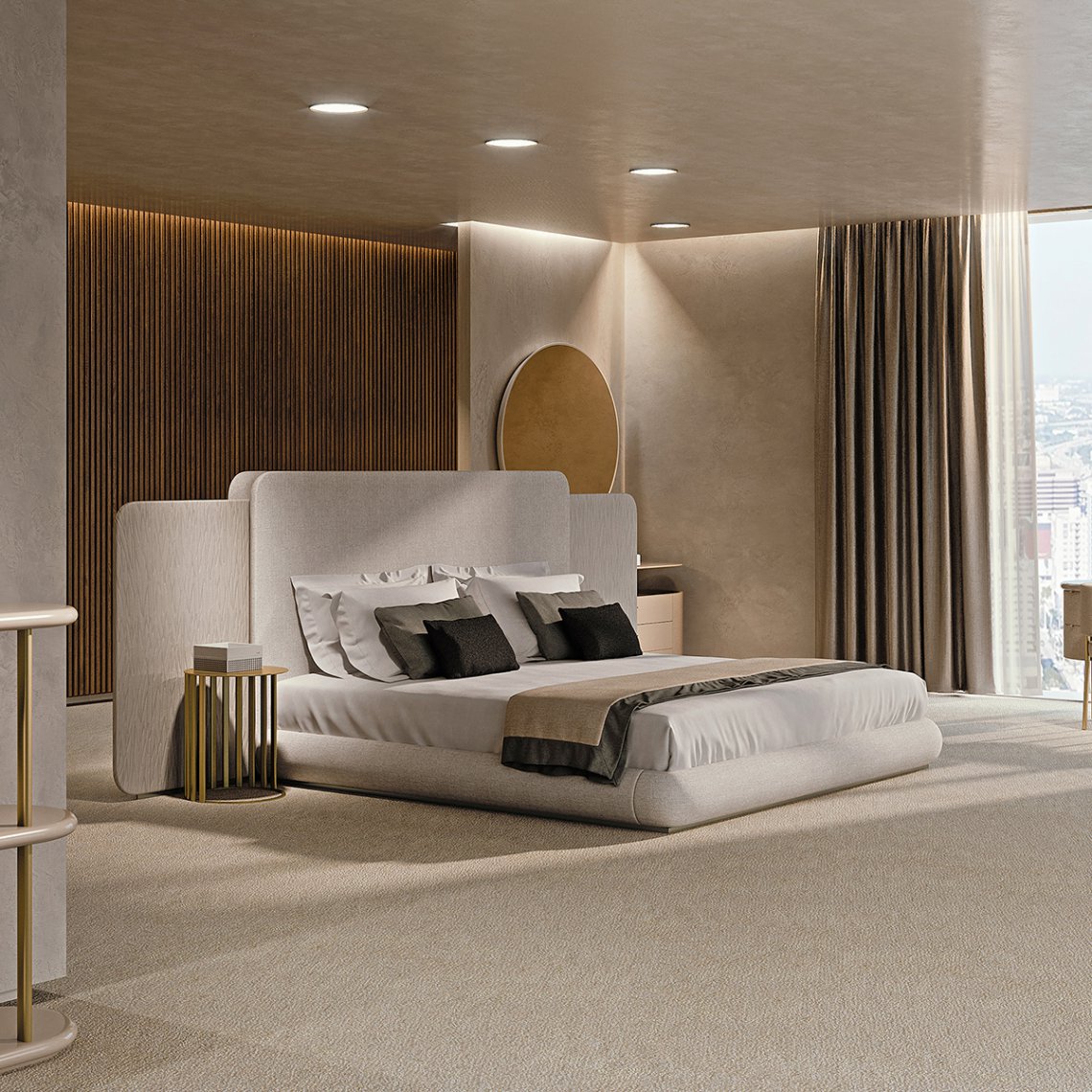 In the bedroom area of the Roma collection, the bed plays a fundamental role, made with a wing structure, completely covered in fabric or leather, both in the headboard and in the bed frame. The side wings can be made with embroidery, in the characteristic texture of the collection. The Roma bed is available in different finishes as per sample card.