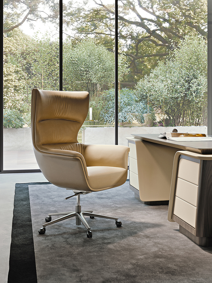 The Blues office armchair offers an ergonomic seat that can be made in leather or fabric. The backrest is enveloping to welcome and support the individual, available in the high or low version. The Blues armchairs are available in different finishes as per sample card.