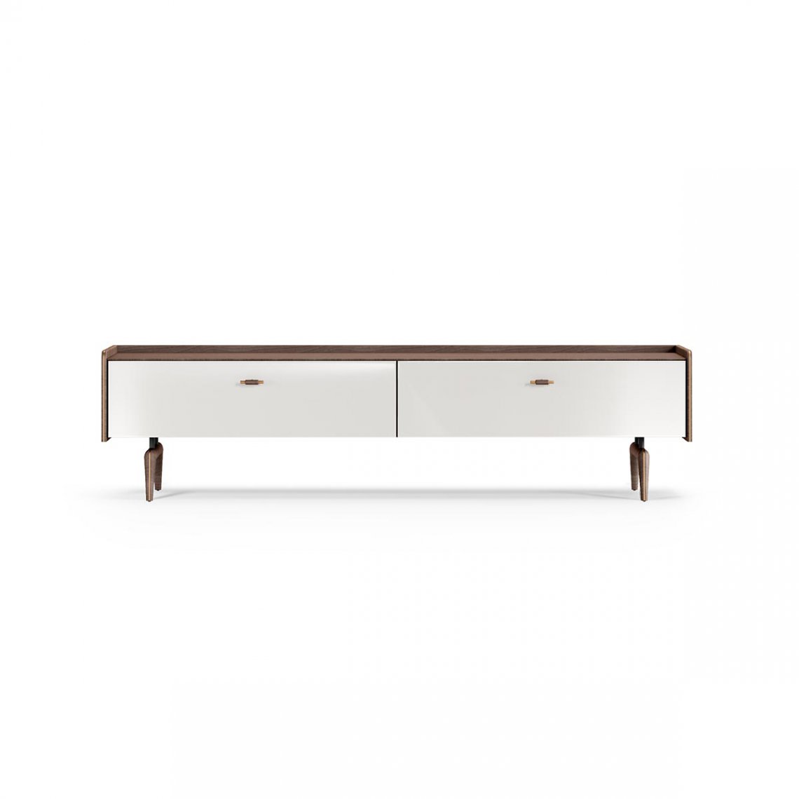 The Blues TV cabinet is designed to be highly customizable. The walnut wood structure supports two drawers whose fronts can be made of natural wood, leather or glossy lacquered wood. The top can be produced in natural wood, leather or precious marble. The Blues tv unit is available in different finishes as per sample books.