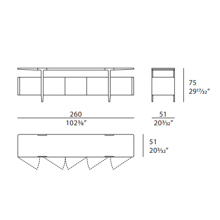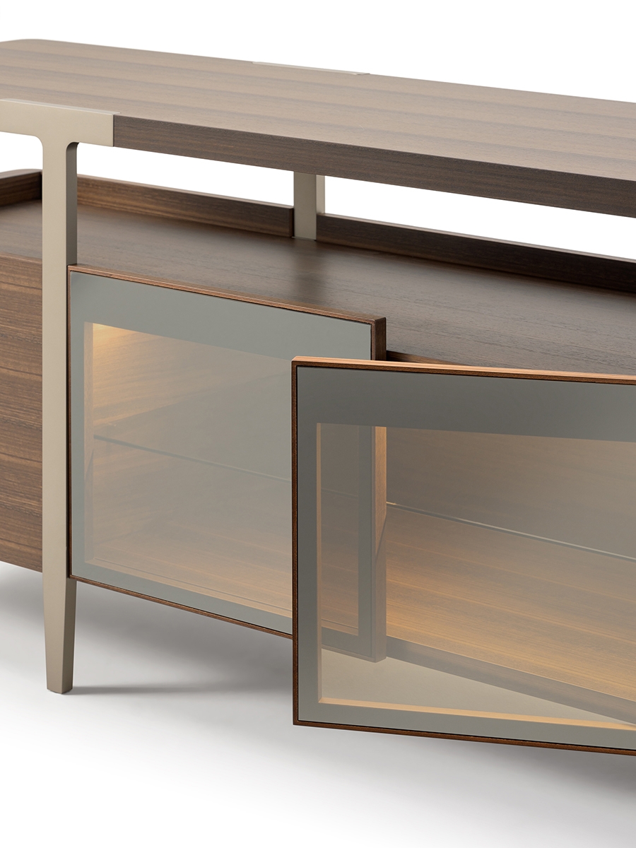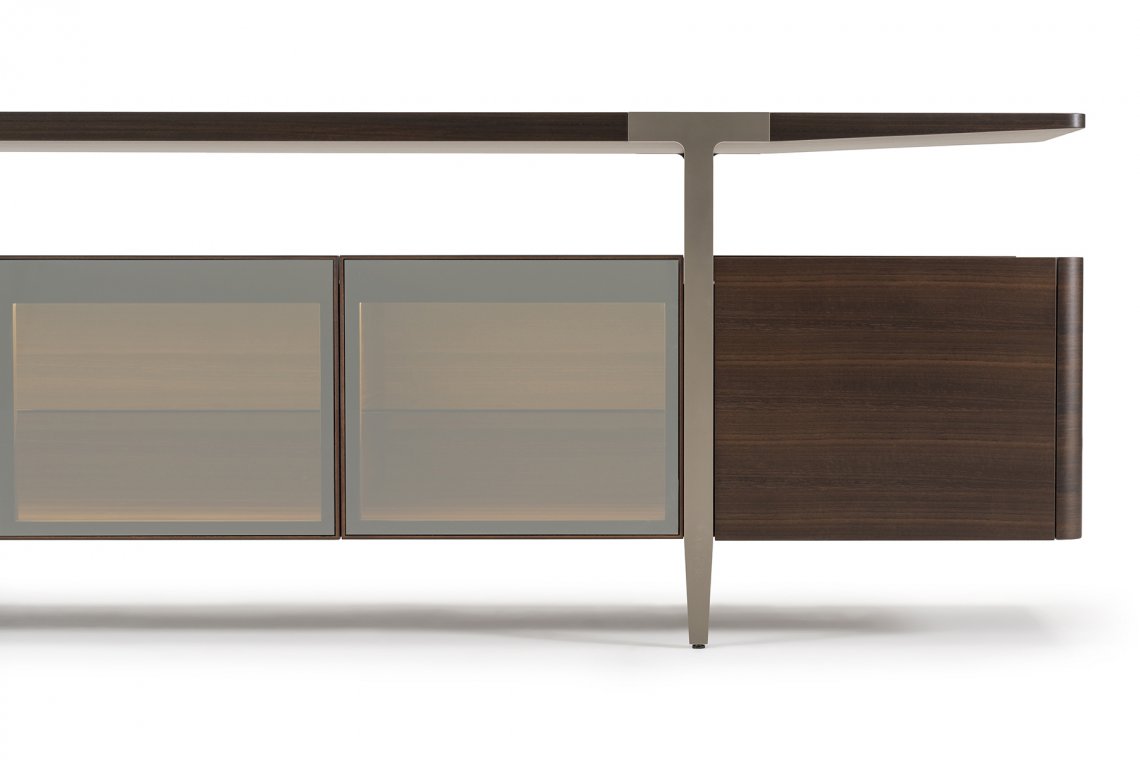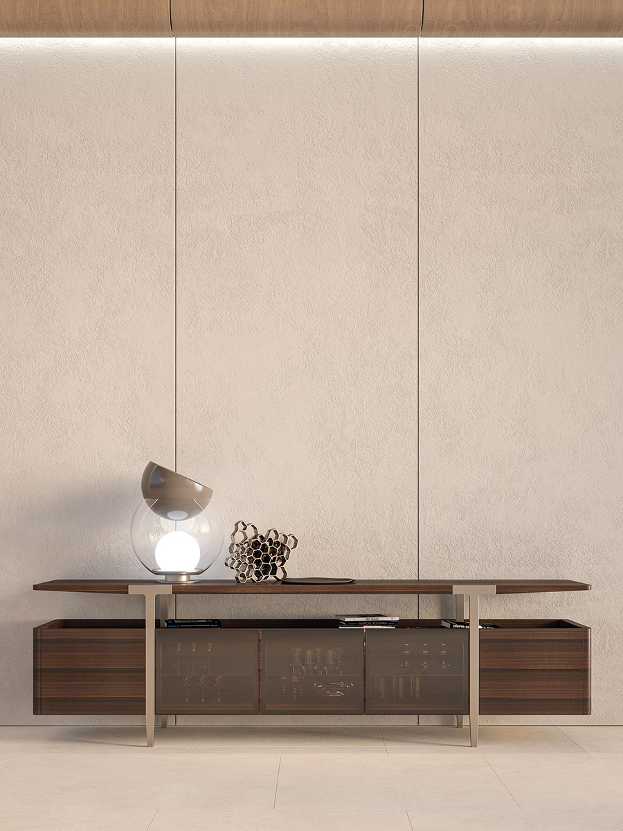 The sideboard of the Domus collection stands out for a strongly characteristic design, in which the container seems to remain suspended between the metal legs and the top. The top is available in wood or marble, while the doors in wood or with a frame in solid wood and glass inserted flush. The Domus sideboard is available in different finishes as per sample card.