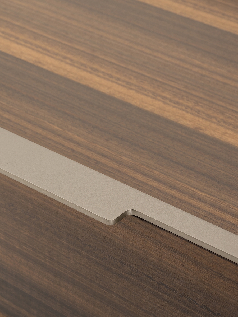 The ches of drawers of Domus collection has shapes made elegant by the sides with curved corners and by the long handle with curved metal silhouette. The structure, the top and the drawers are in Eucalyptus, while the details and the handles in Matt Light Platinum metal. The Domus chest of drawers is available in different finishes as per sample card.