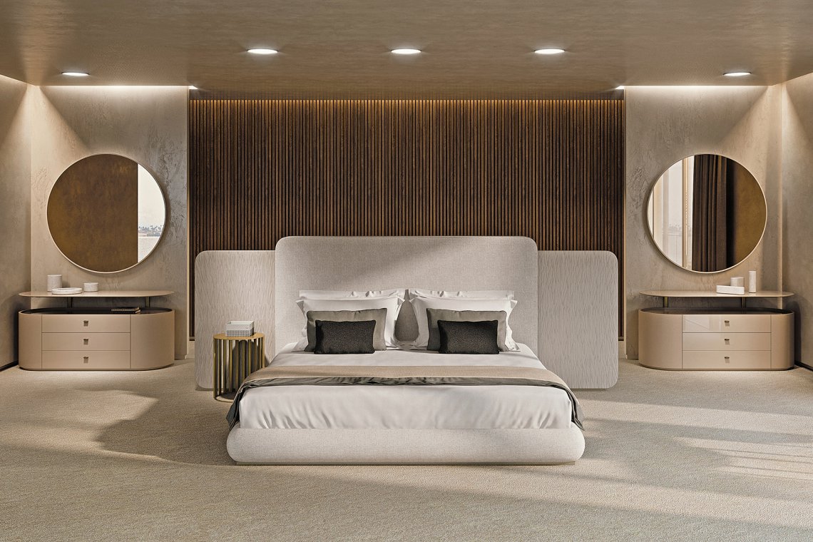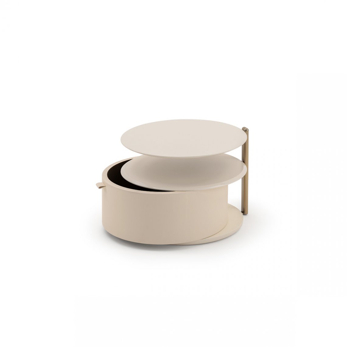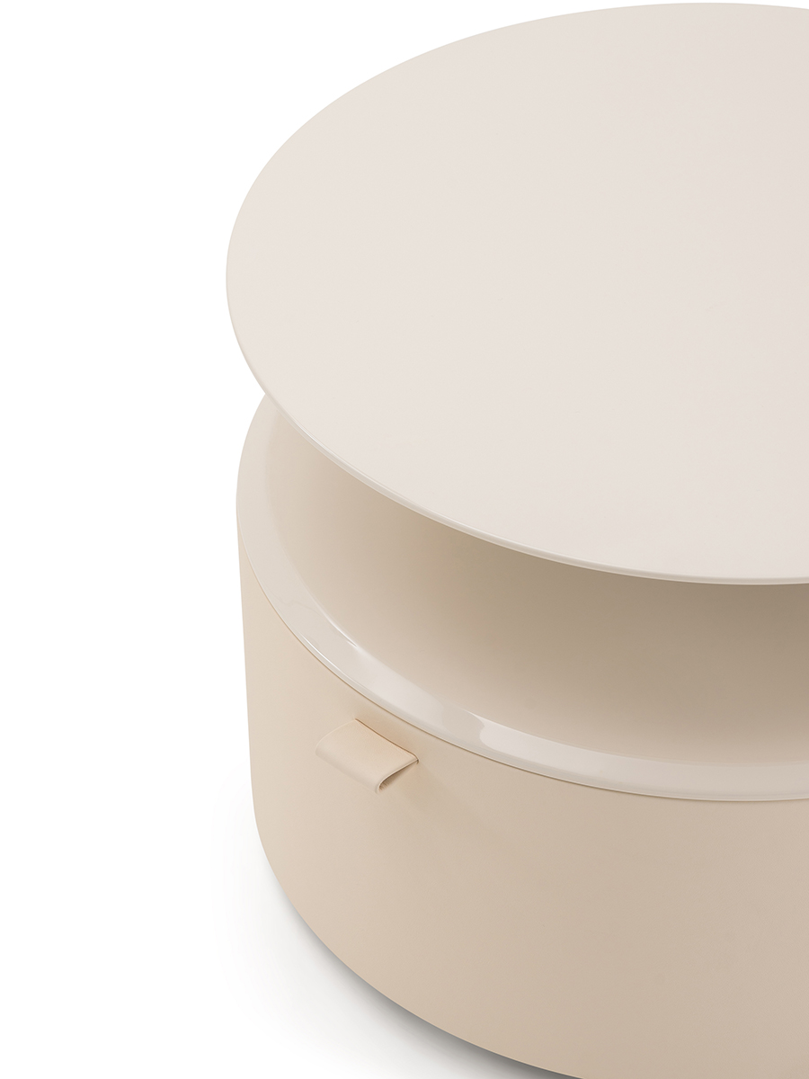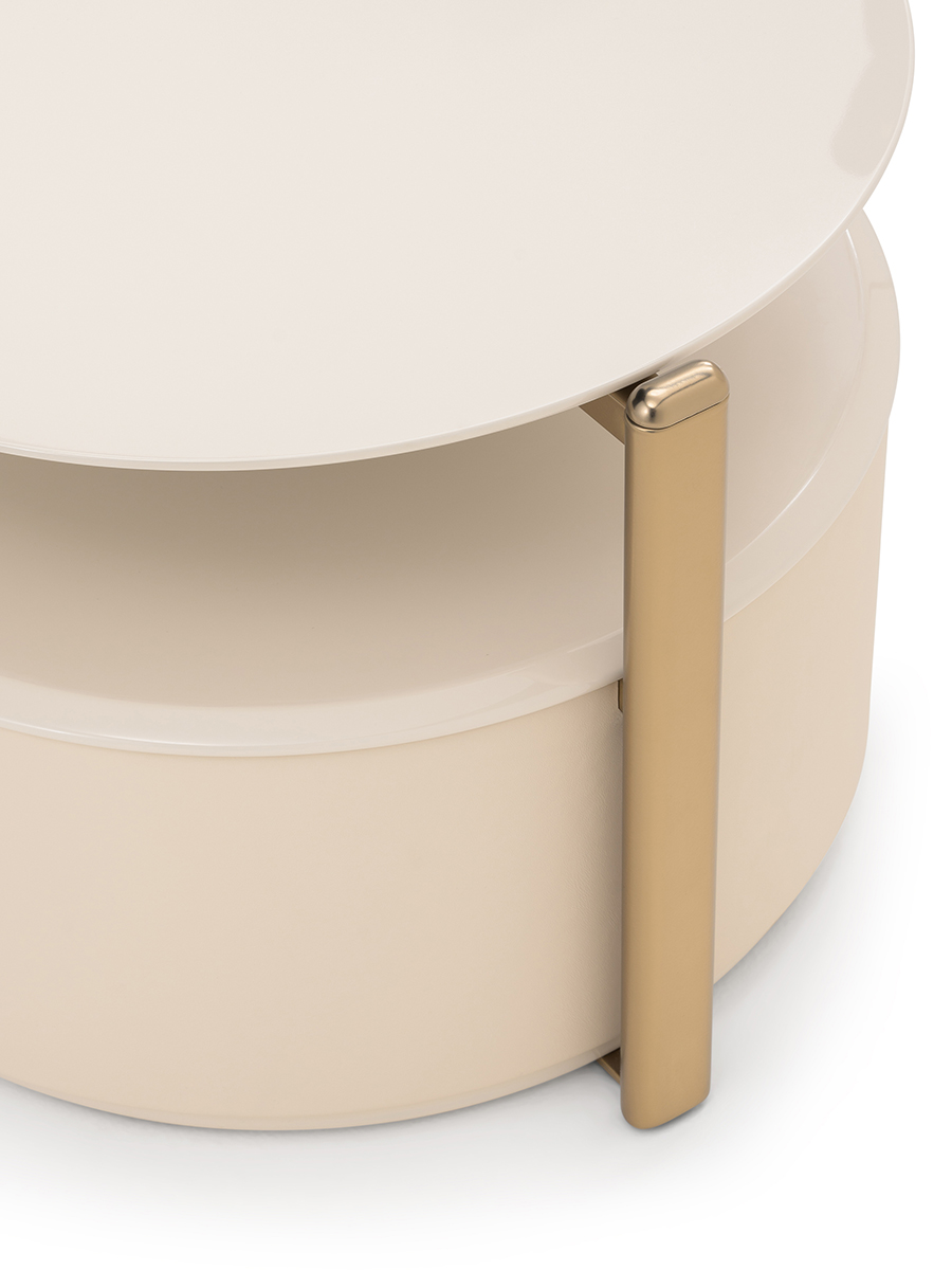 The Roma bedside table has a round shape that follows the trend of the shapes of the entire collection. The drawer integrates perfectly with the structure, the shelf is almost suspended giving extreme lightness. The Roma bedside table is available in different finishes as per sample card.