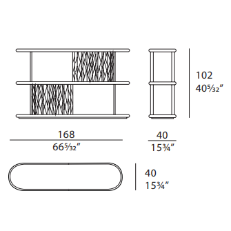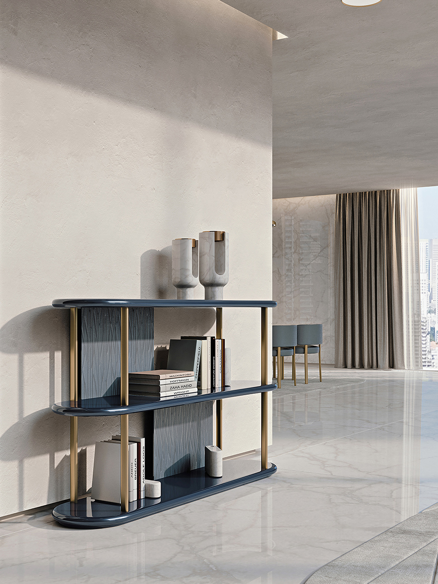 The shelves of the etagere, made of single-color glossy lacquered wood, are vertically interspersed on the back with padded panels that can be lined in leather and embroidered. The vertical metal structure of the etagere is available in two finish variants. The etagere roma Roma is available in different finishes as per sample card.