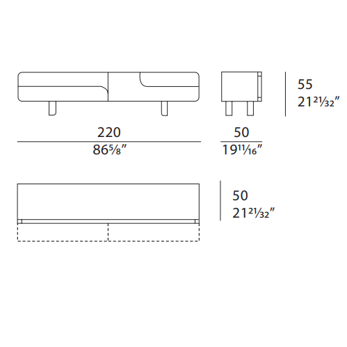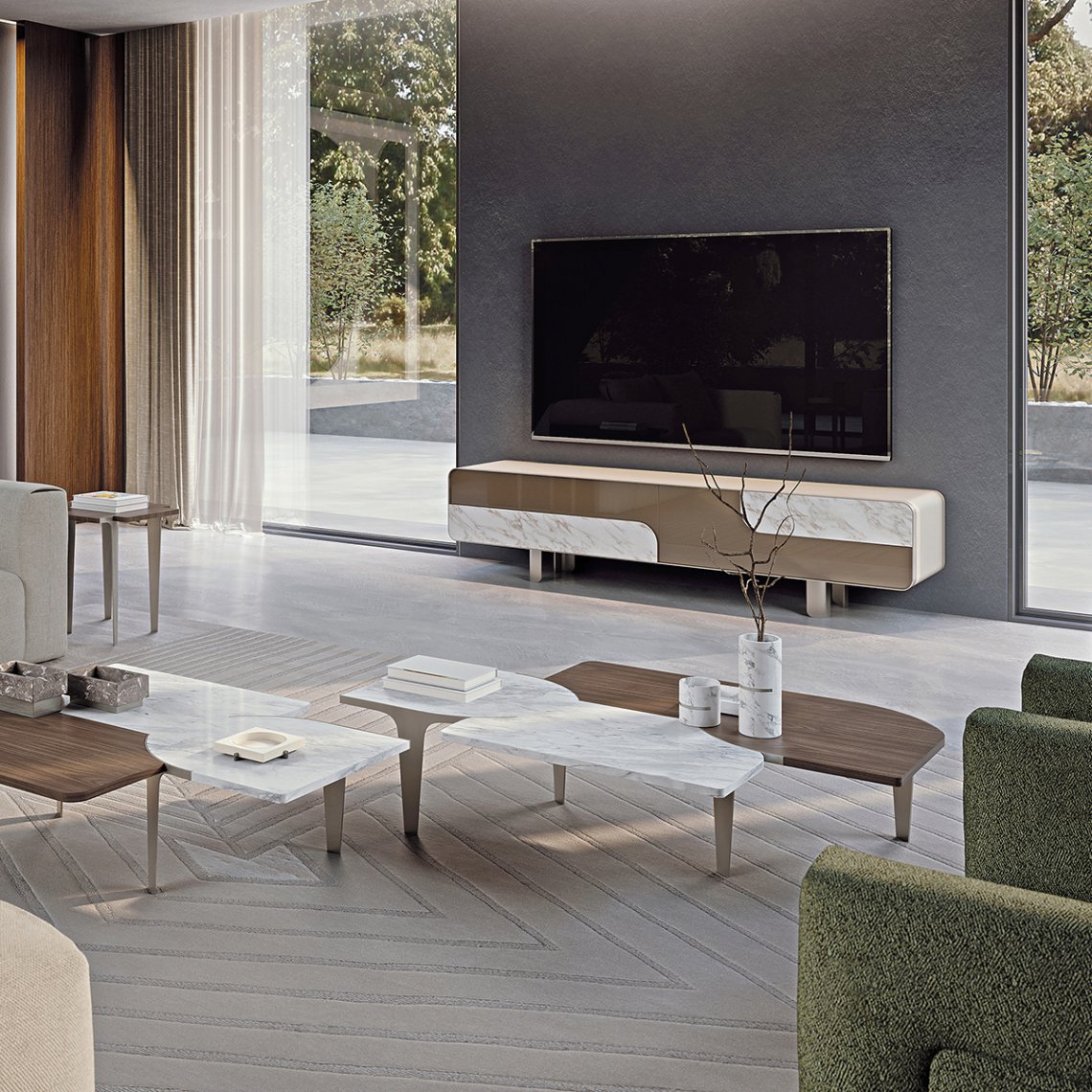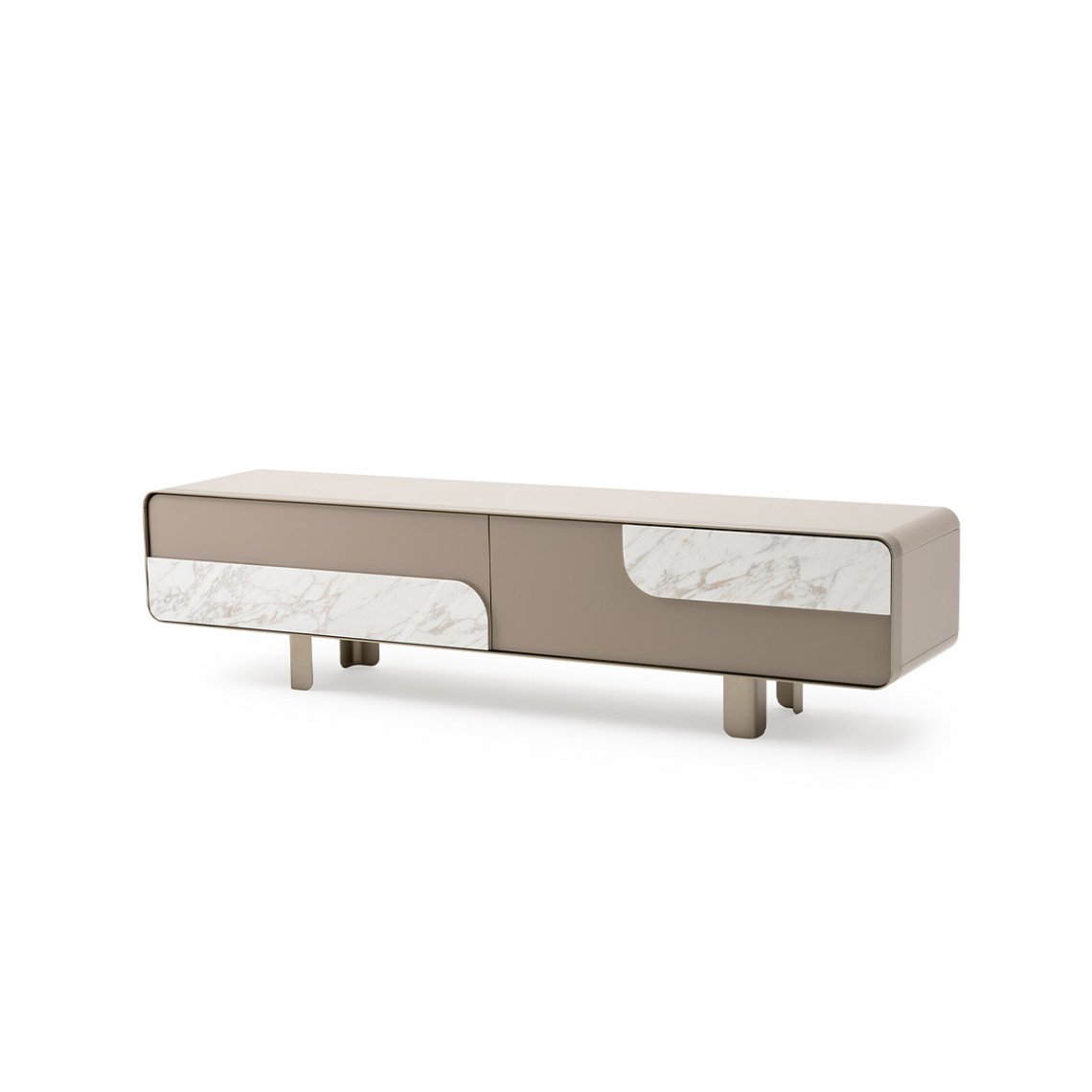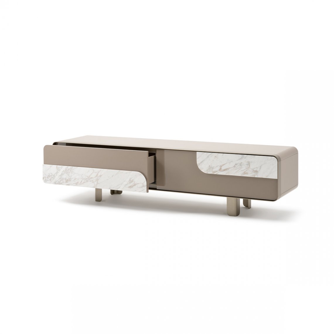The Tv unit of the Soul collection has a metal edge that surrounds the entire front perimeter, emphasizing the sweetness of the shapes, while the absence of the handles finds an answer in the detail – in walnut or marble – applied to the lacquered structure, essential for the opening of the doors and drawers. The Soul Tv unit is available in different finishes as per sample.