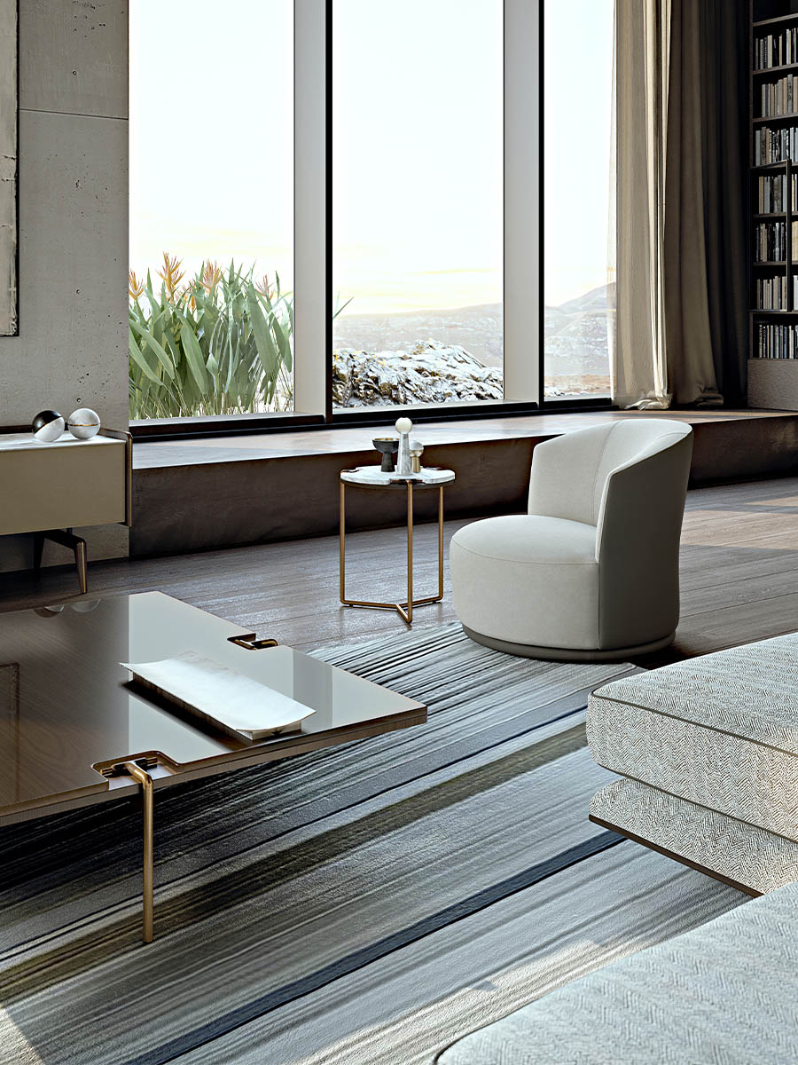 Available in three sizes, round, rectangular or square, the coffeetables from the Blues collection match perfectly with the sofa from the same collection, recalling its style, details and colors. The marble or bronzed glass top allows you to customize and embellish this piece of furniture at will. Blues coffee tables are available in different finishes included in our collection
