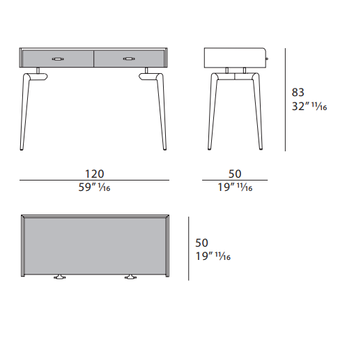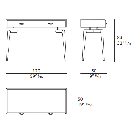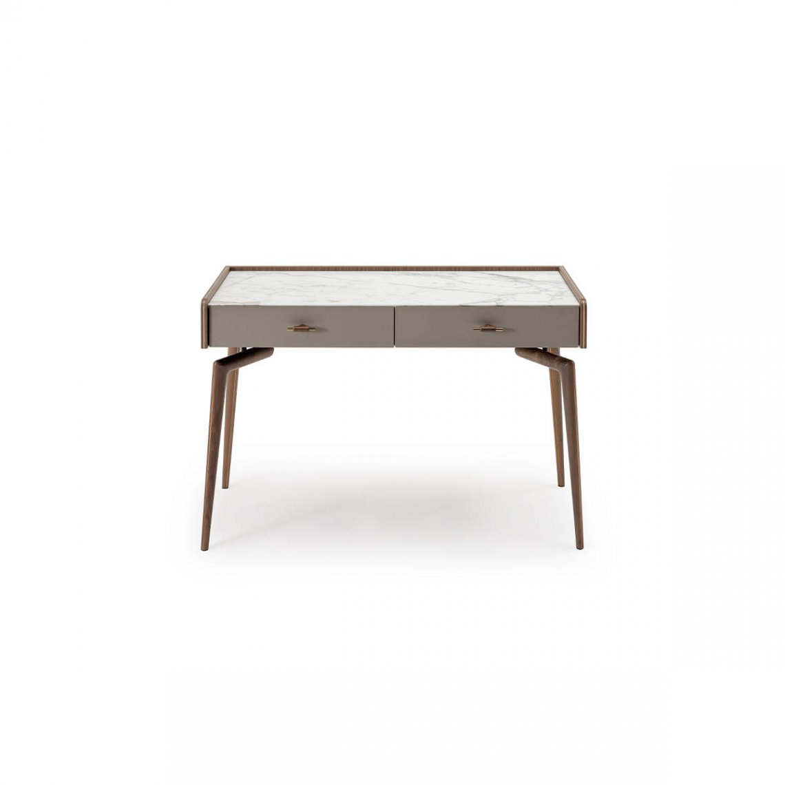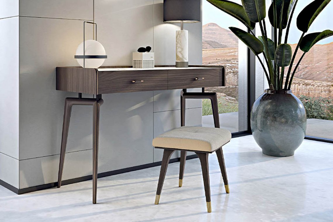 The Blues dressing table has a walnut wood structure whose design, with tapered legs, has a touch of vintage. The two drawers can be made with leather or wood fronts. The top can be customized in marble, wood or leather. The Blues dressing table is available in different finishes as per sample books.