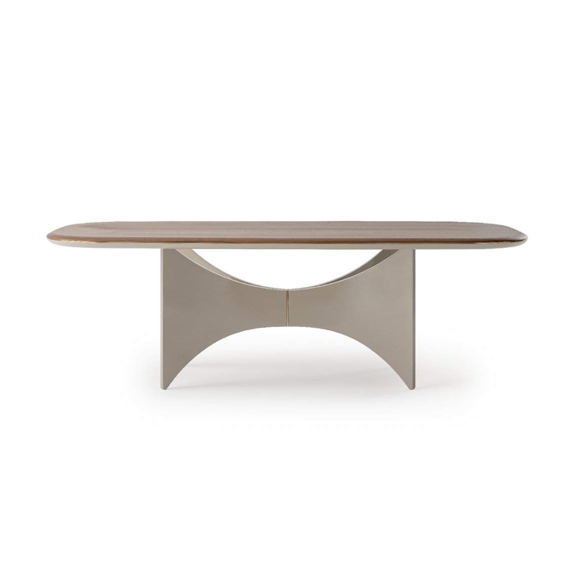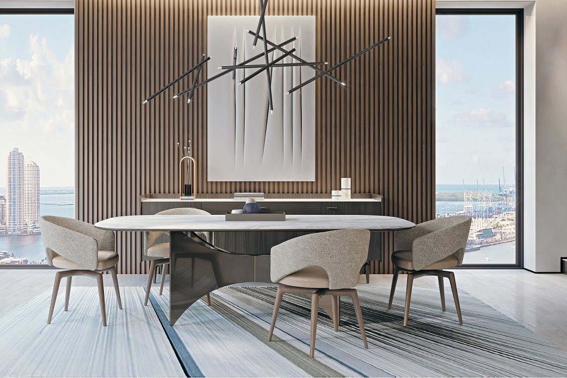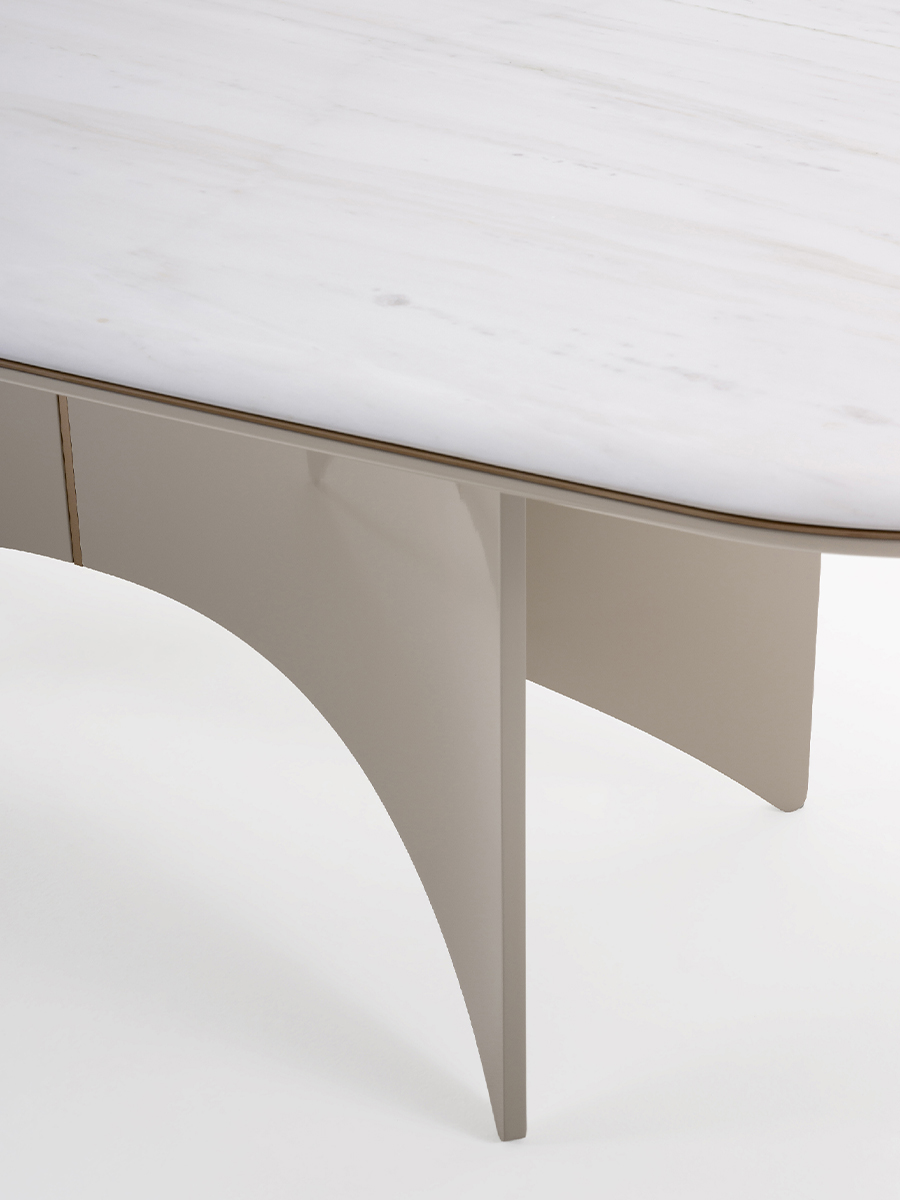 The table of the Blues collection has a base that evokes wings, both aesthetic and functional, supporting the top, in an elegant game of lines. A metal detail makes the central meeting point sophisticated. The top is characterized by rounded corners and circular and light lines, as well as the profile, always rounded and enriched on the entire perimeter with the same metal detail of the base. The different varieties of materials and finishes of the top – in wood or marble – and of the base – in walnut or glossy lacquered wood – make the table a design element suitable for any interior. The Blues table is available in different finishes as per sample card.