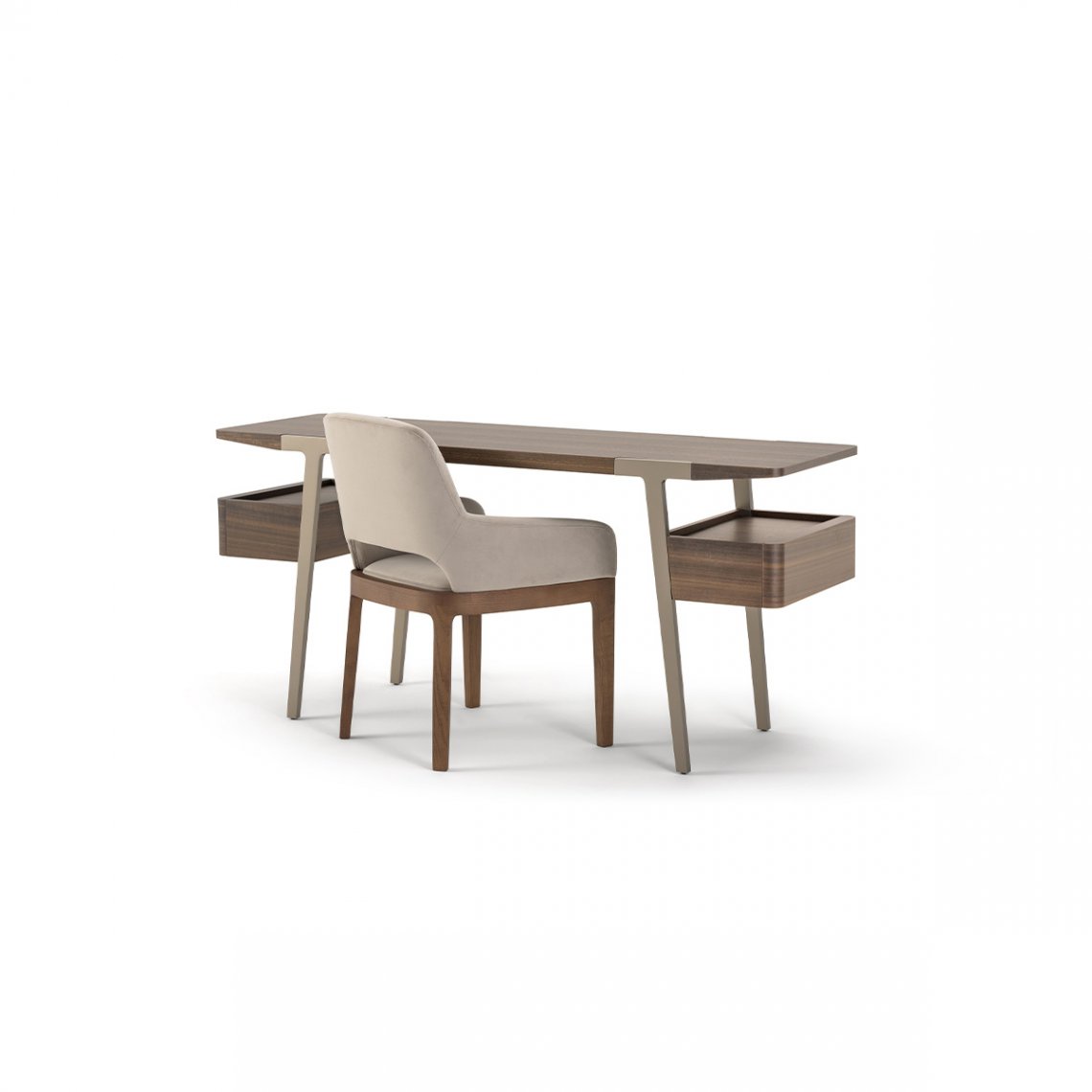 The bedroom area is completed by the Domus dressing table, a versatile and functional piece of furniture thanks to the top and two side drawers in Eucalyptus. The legs are made of Matt Light Platinum metal. The Domus dressing table is available in different finishes as per sample card.