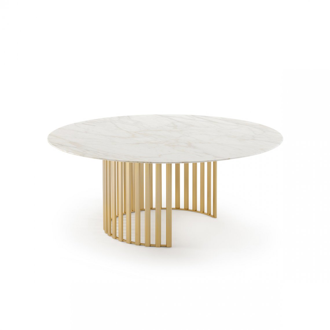The Roma round table confirms the circular thinking of the entire collection in the presence of the legs and the top and is characterized by a singular metal base composed of vertical tubulars (available in the Champagne Gold and Graphite Gray finishes), with a round top in single-color lacquered marble or wood. The Roma table is available in different finishes as per sample card.