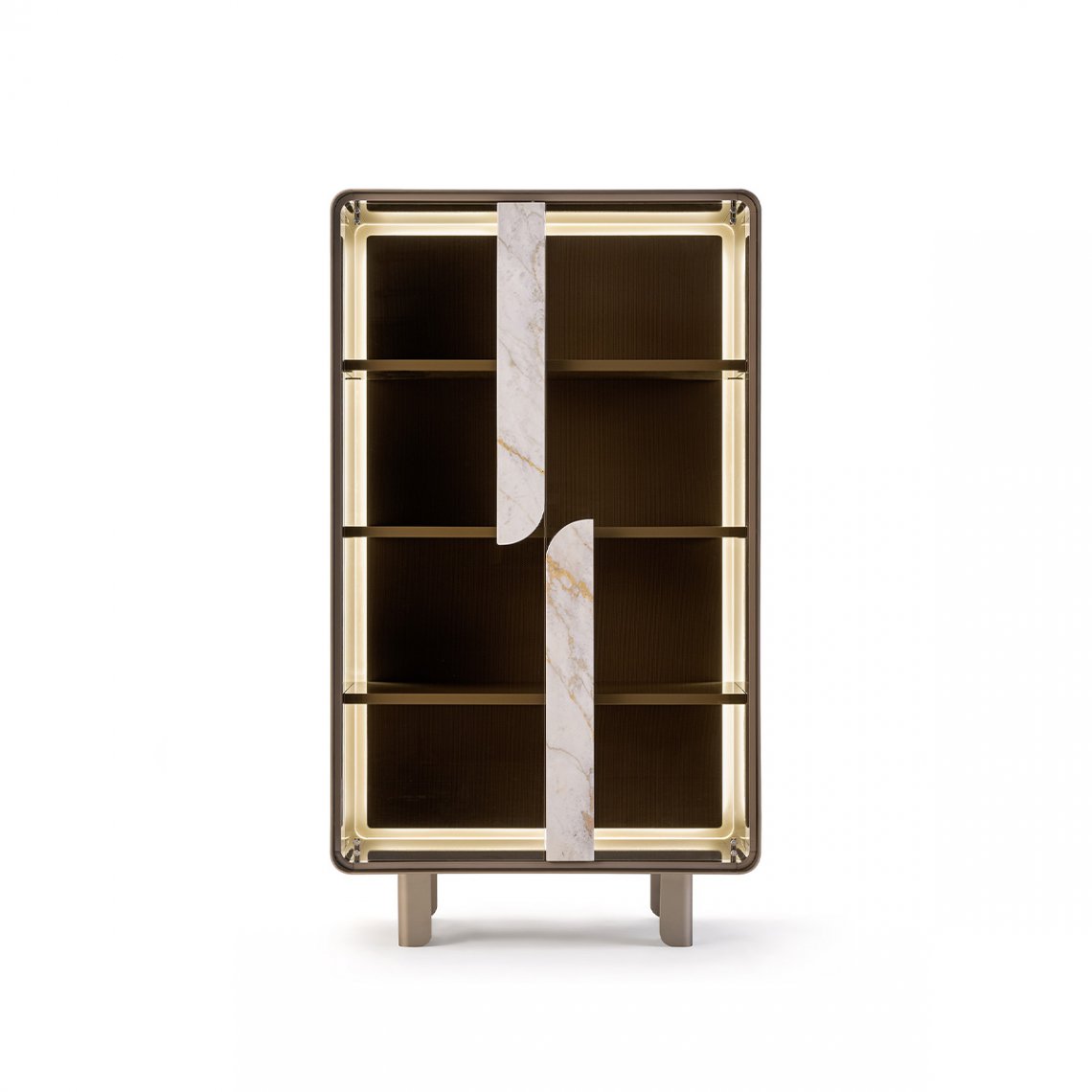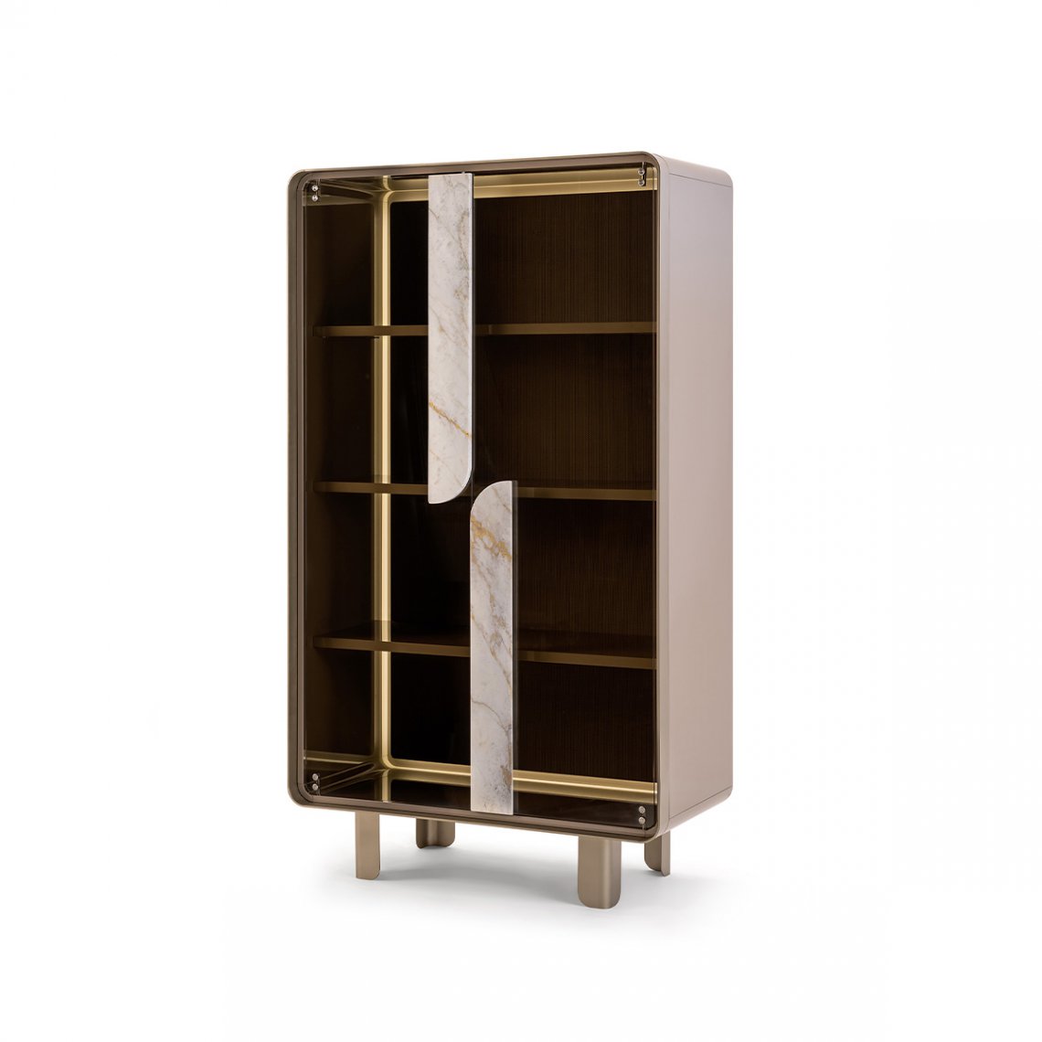 The vitrine of the Soul collection incorporates the metal profile and the alternation of full and empty spaces of the sideboard that also find space in the verticality of the cabinet. The linearityof the glass doors is interrupted by the marble inserts emphasizing the coexistence of such different materials, making the new products suitable for being welcomed in design environments with a strong personality. The Soul vitrine is available in different finishes as per sample card.