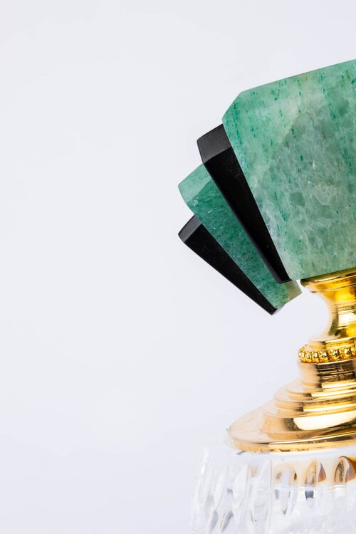 The diamond’s brightness of the french cut crystal exalts the deep color and grain of the stone. A jewel detail that embellishes the perfume bottle in a perfectly Art Decò style and yet with a contemporary design. Each crystal is hand-cut and therefore unique.