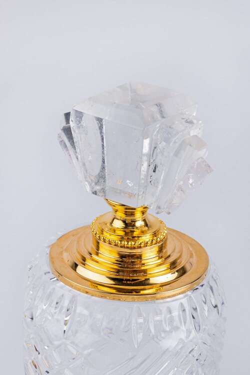The diamond’s brightness of the french cut crystal exalts the deep color and grain of the stone. A jewel detail that embellishes the perfume bottle in a perfectly Art Decò style and yet with a contemporary design. Each crystal is hand-cut and therefore unique.