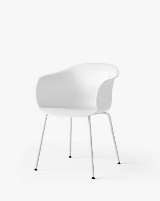 Veneer sheets formpressed together towards a solid wood insert. Milled into shape and lacquered. Natural Rattan weaved around a powder coated stainless steel frame.