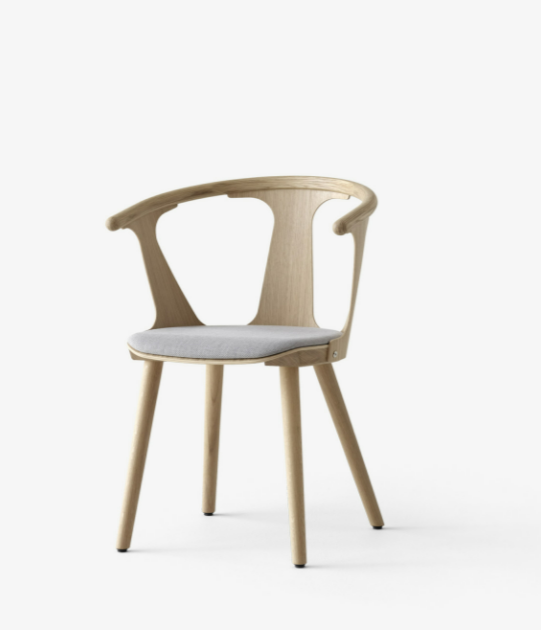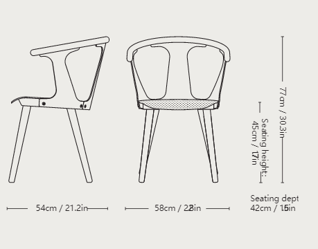 Veneer sheets formpressed together towards a solid wood insert. Milled into shape and lacquered. Natural Rattan weaved around a powder coated stainless steel frame.