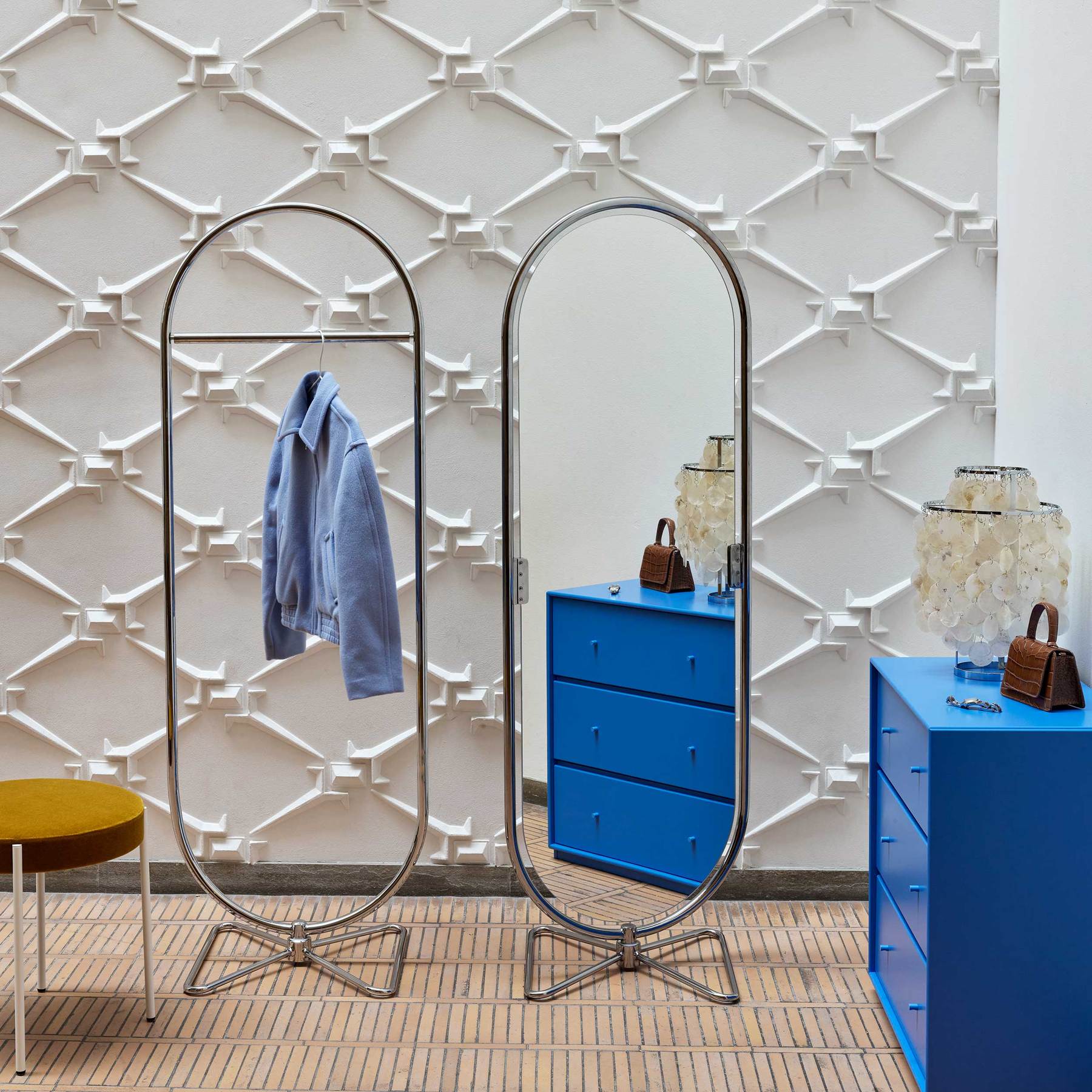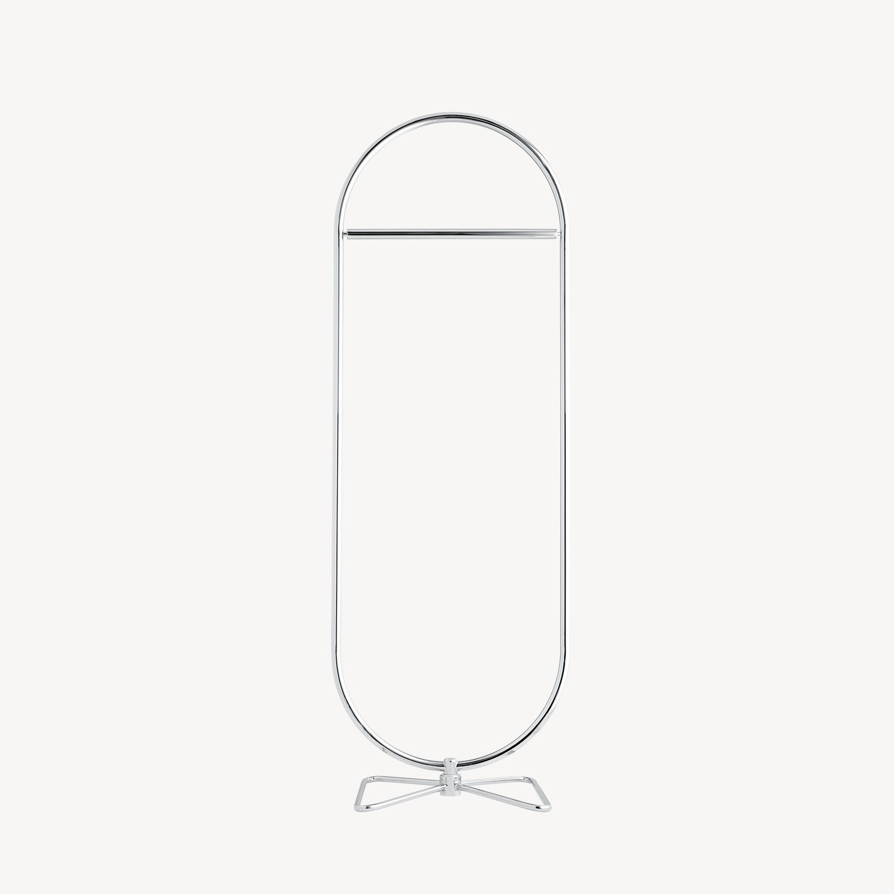 Sharing features with the System 1-2-3 chairs, the System 1-2-3 Rack is an elegant element for the wardrobe, bathroom or wherever there is a need for a stylish coat rack. The design use an oval chrome plated frame with a coat rack. The System 1-2-3 Rack sits on a butterfly base with swivel function.