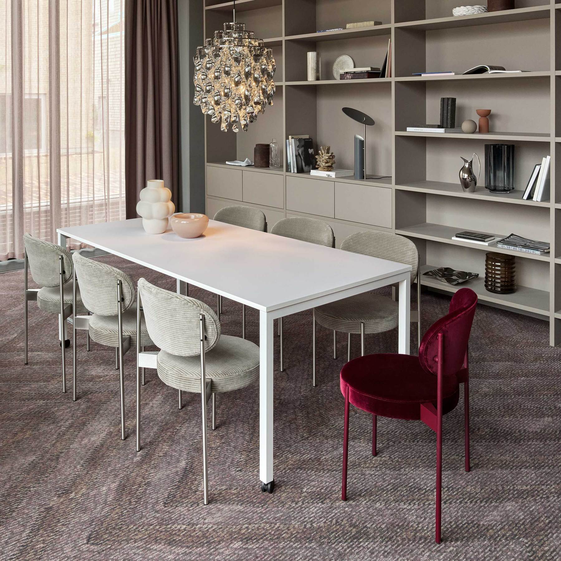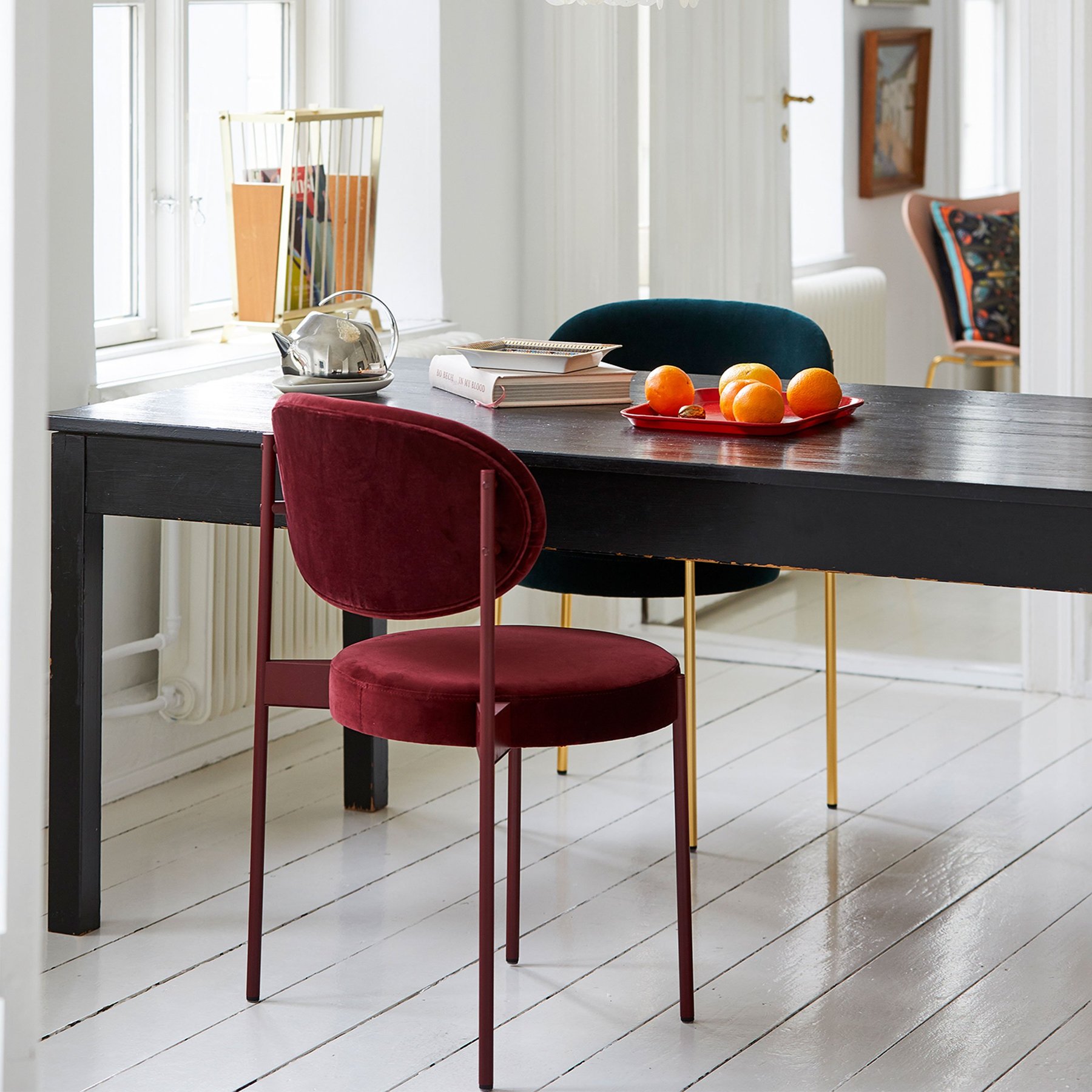 Verner Panton designed the Series 430 Chair as a study in simplicity, while providing the same comfort as an armchair. He did so by applying traditional webbing to the fully upholstered seat to adjust for body weight and create a wide nestling backrest and place it on a slender elegant frame that mounts on the outside of the seat and back.