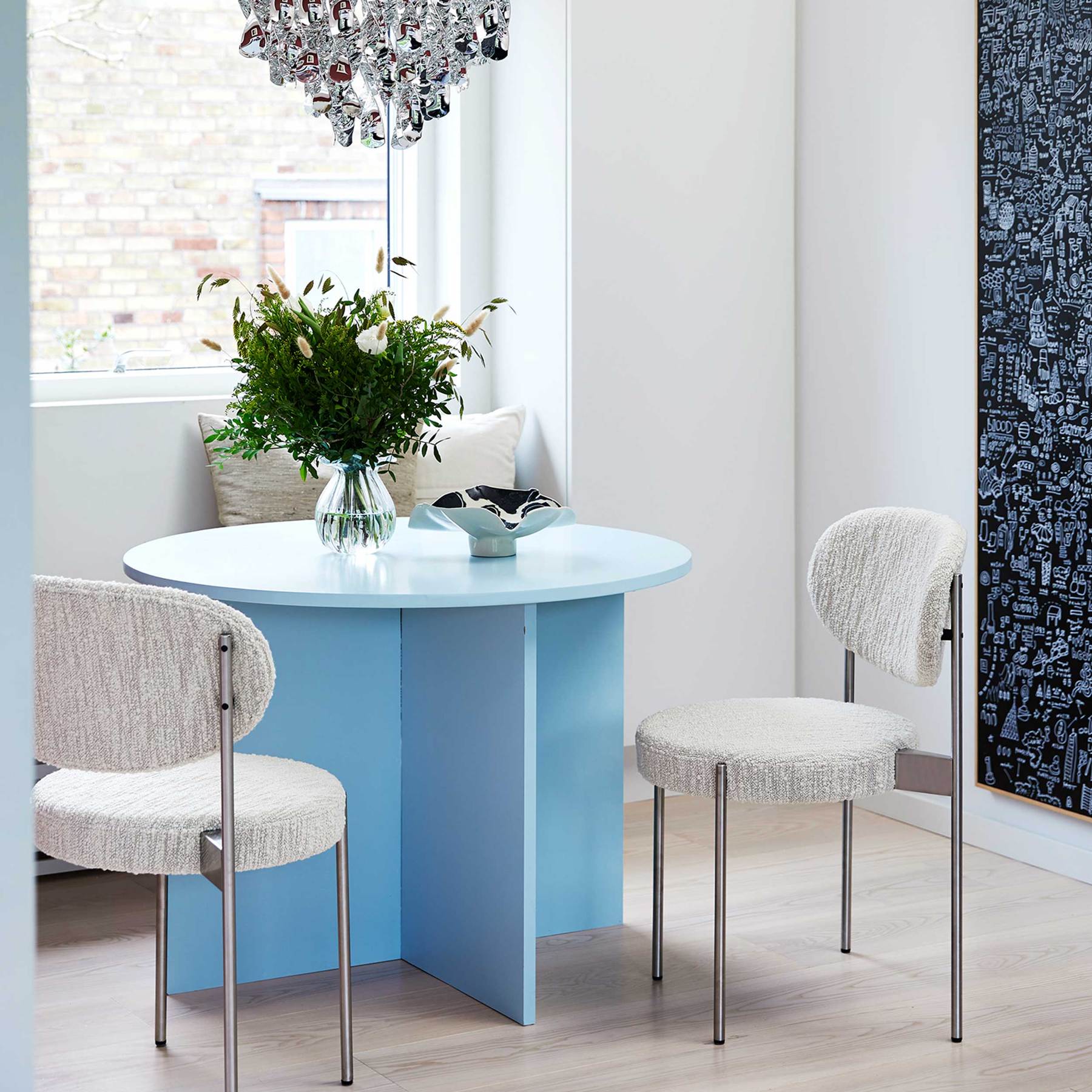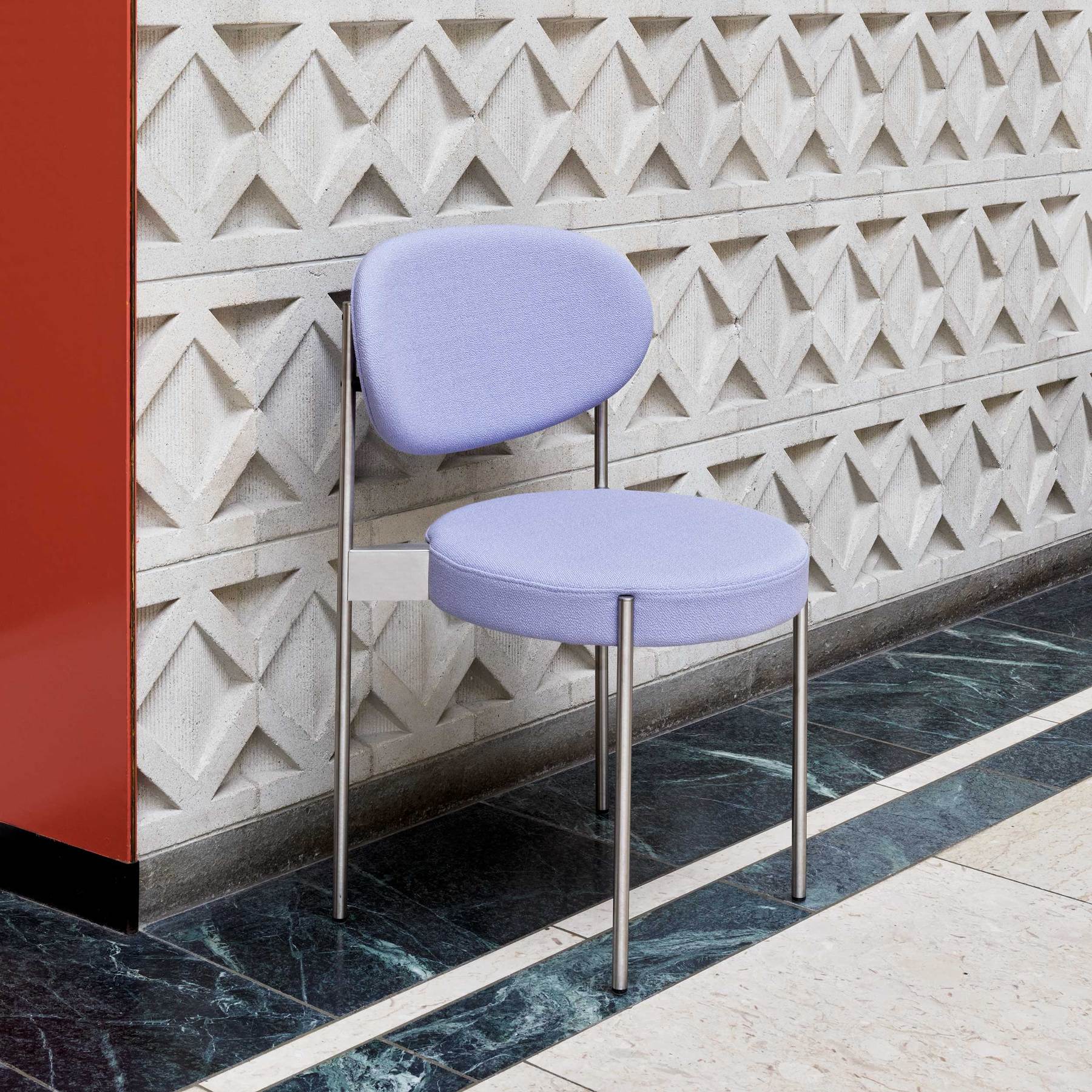 Verner Panton designed the Series 430 Chair as a study in simplicity, while providing the same comfort as an armchair. He did so by applying traditional webbing to the fully upholstered seat to adjust for body weight and create a wide nestling backrest and place it on a slender elegant frame that mounts on the outside of the seat and back.