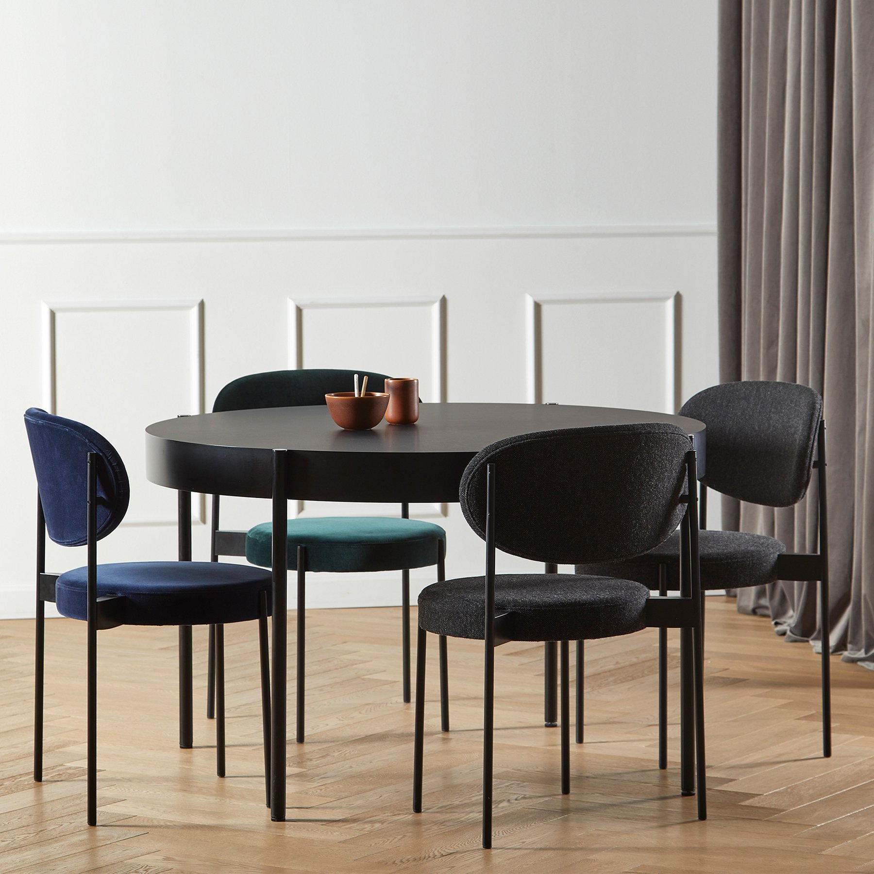 Verner Panton designed the Series 430 Chair as a study in simplicity, while providing the same comfort as an armchair. He did so by applying traditional webbing to the fully upholstered seat to adjust for body weight and create a wide nestling backrest and place it on a slender elegant frame that mounts on the outside of the seat and back.