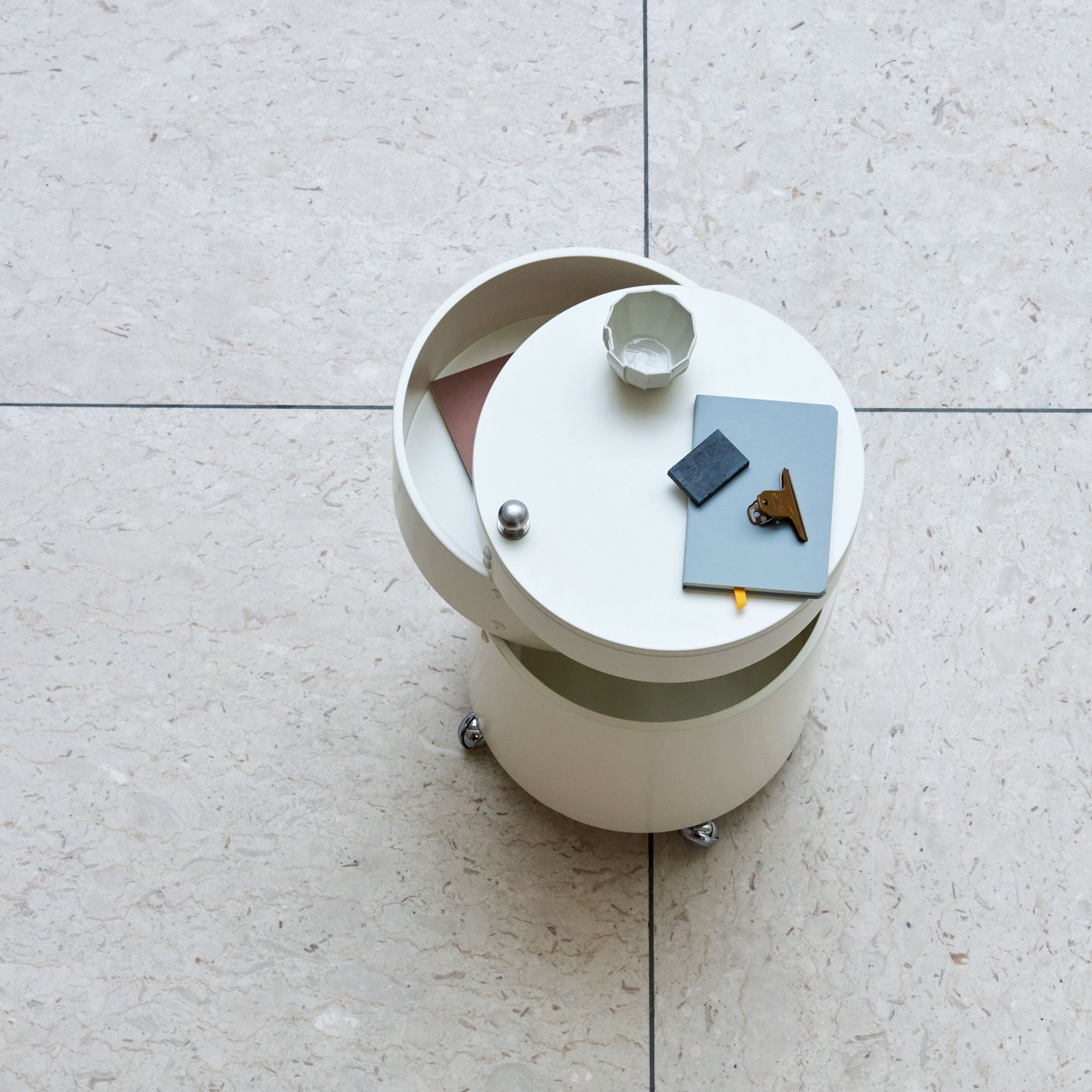 Adaptable side table and mobile storage unit in one. Barboy consists of three oval-shaped drawers, which can be pulled out fully so the whole surface can be used. Barboy is a typical example of Panton’s furniture, in which he combines a matt surface with a shiny chrome handle and wheels, investing the piece with an elegant contrast.